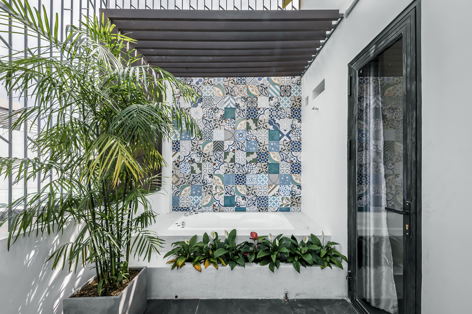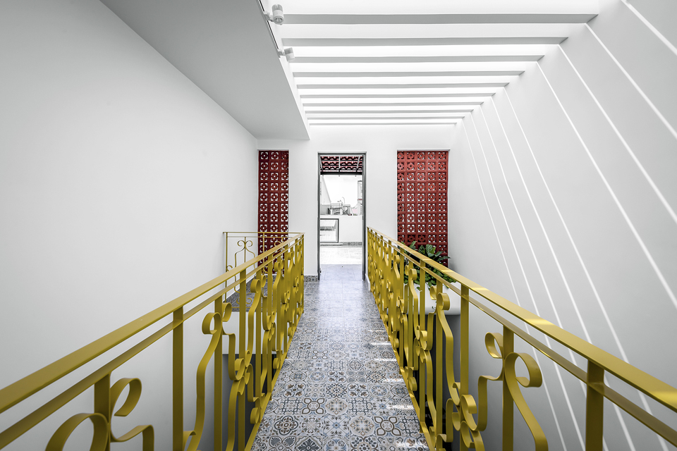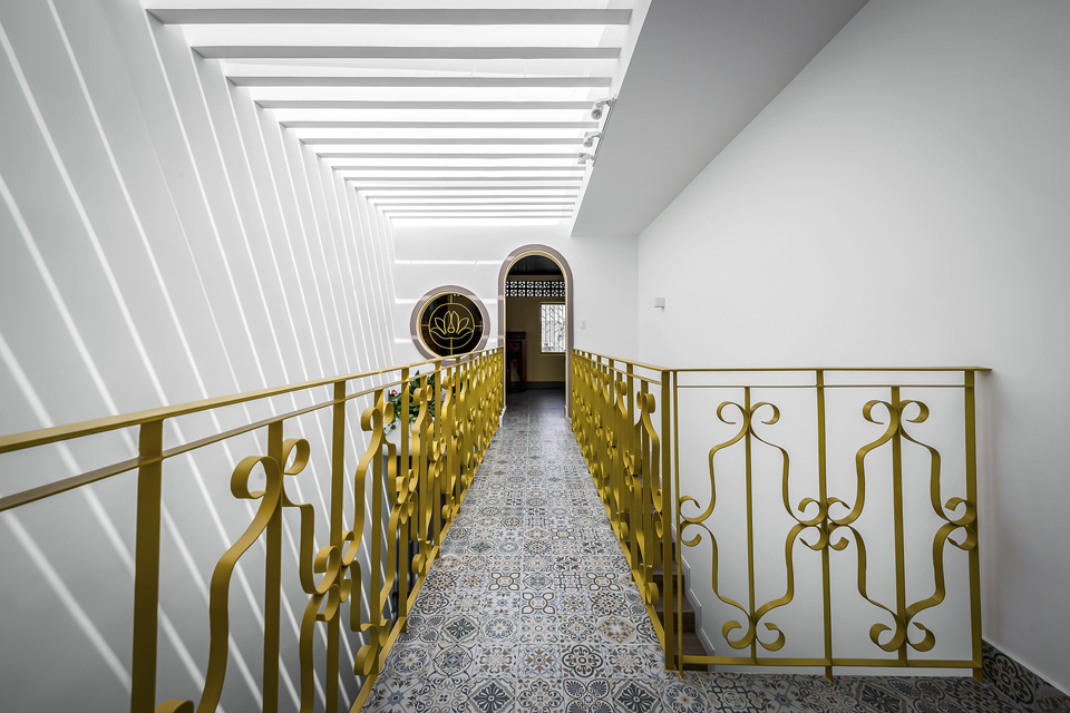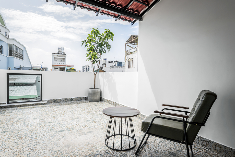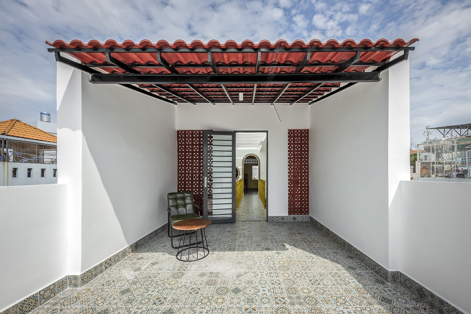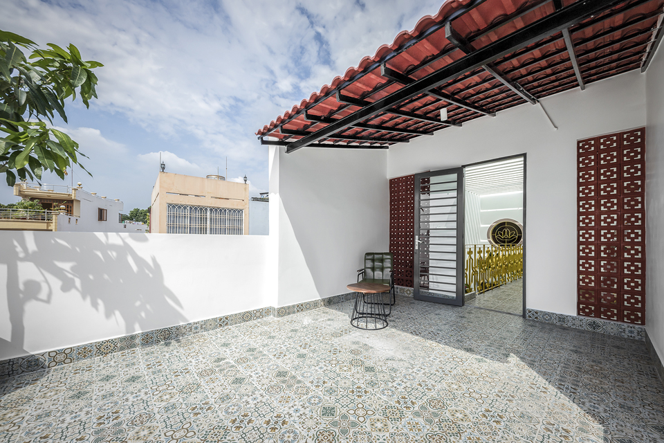 Phần tầng sân thượng lấy cảm hứng những chi tiết, vật liệu và màu sắc truyền thống văn hóa của các kiến trúc cha ông để phối với không gian hiện đại, tạo cảm giác ấm cúng thân quen khi bước lên khu vực thờ cúng tâm linh.