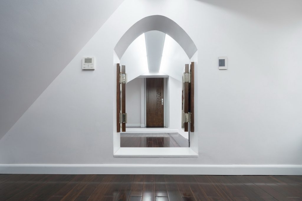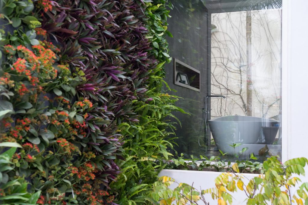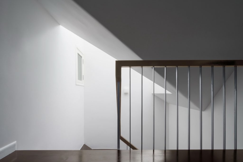 Một phần mái của gara hiện trạng được cắt đi để tạo ra một vườn thẳng đứng trên tường và một vườn khô dưới mặt sàn. Giải pháp này giúp thay đổi lại giao thông tiếp cận vào sảnh chính của ngôi nhà, cắt thêm mái cho ánh sáng cầu thang, nâng cao phần mái phía sau để có được những phòng chức năng (phòng thờ, phòng giặt phơi, không gian chơi cho trẻ em) được tiện nghi và thú vị nhất.
