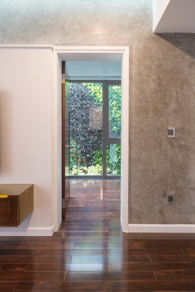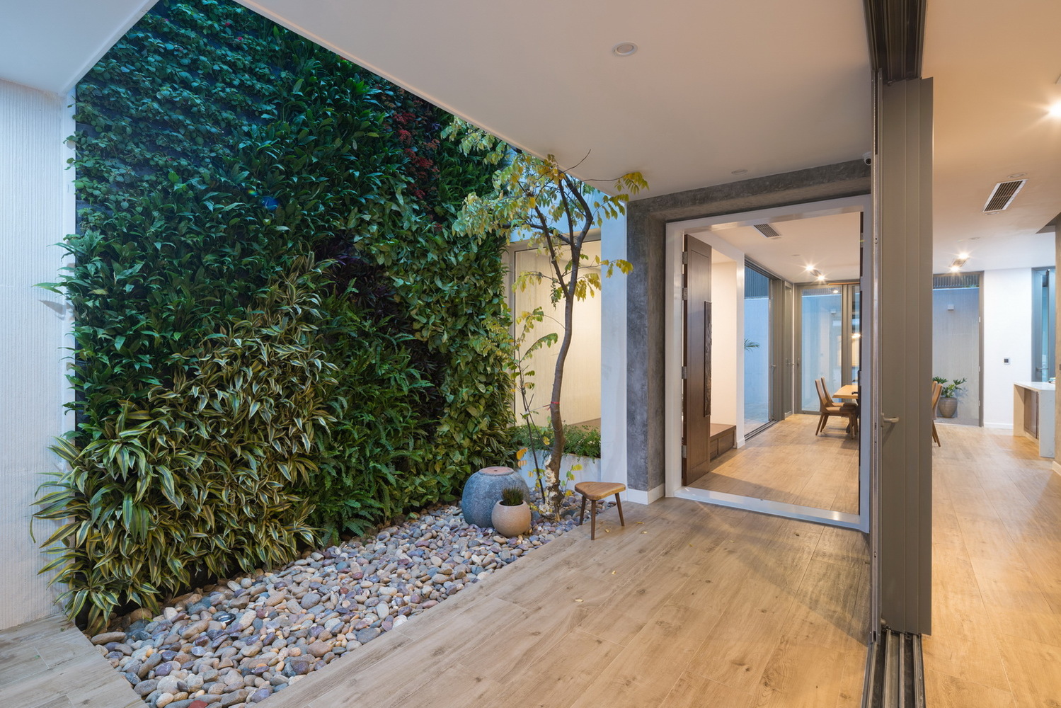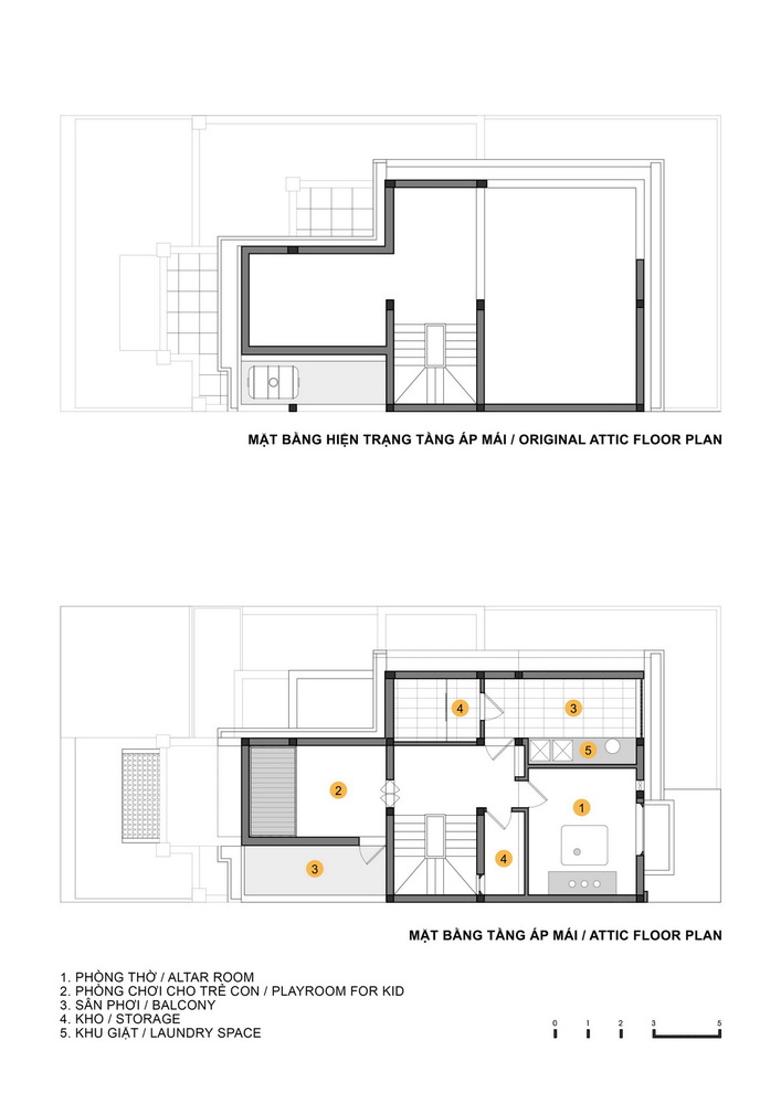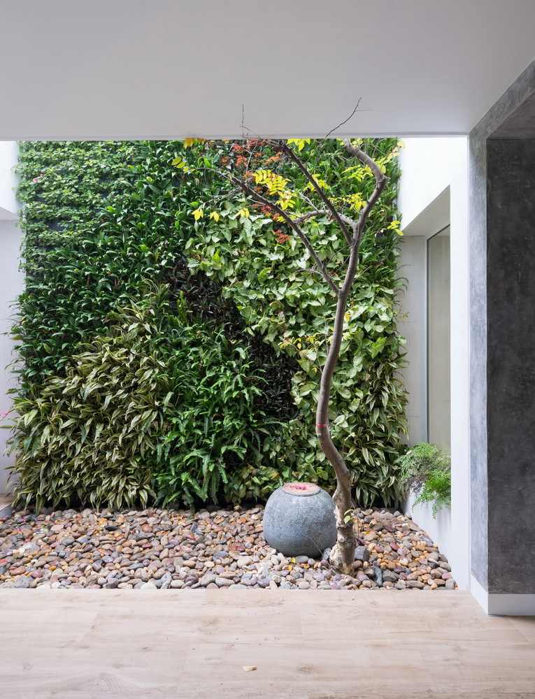 Một phần mái của gara hiện trạng được cắt đi để tạo ra một vườn thẳng đứng trên tường và một vườn khô dưới mặt sàn. Giải pháp này giúp thay đổi lại giao thông tiếp cận vào sảnh chính của ngôi nhà, cắt thêm mái cho ánh sáng cầu thang, nâng cao phần mái phía sau để có được những phòng chức năng (phòng thờ, phòng giặt phơi, không gian chơi cho trẻ em) được tiện nghi và thú vị nhất.