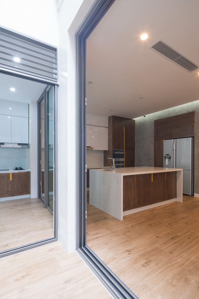 Những vật liệu thô mộc và chi tiết gỗ, thép cắt bằng công nghệ CNC được sử dụng tạo điểm nhấn ở những vị trí đặc biệt nên không gian ngôi nhà rất hiện đại, tiện nghi mà vẫn có chút hồn truyền thống của văn hóa Việt và thiên nhiên.