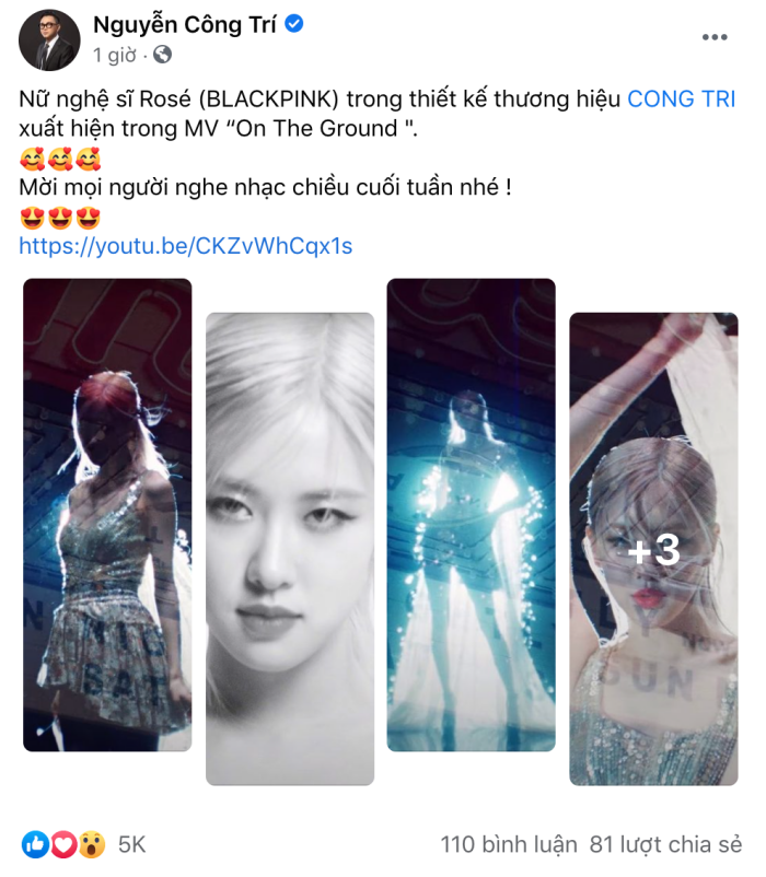 Nhà thiết kế Nguyễn Công Trí xác nhận Rosé (Black Pink) diện thiết kế của mình trong MV solo đầu tiên “On The Ground”.