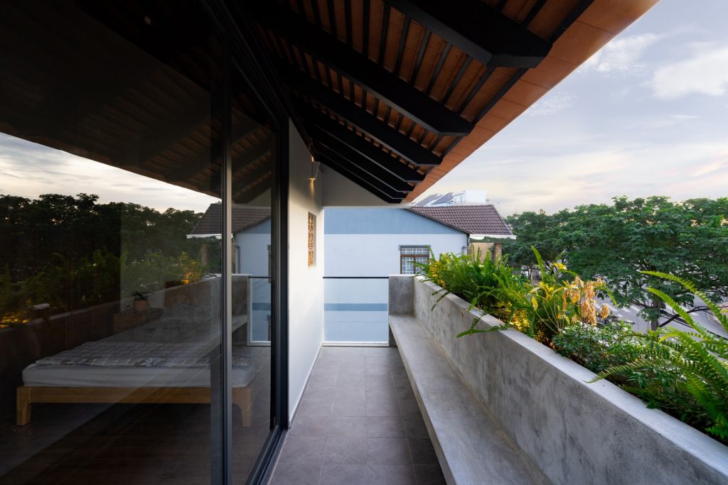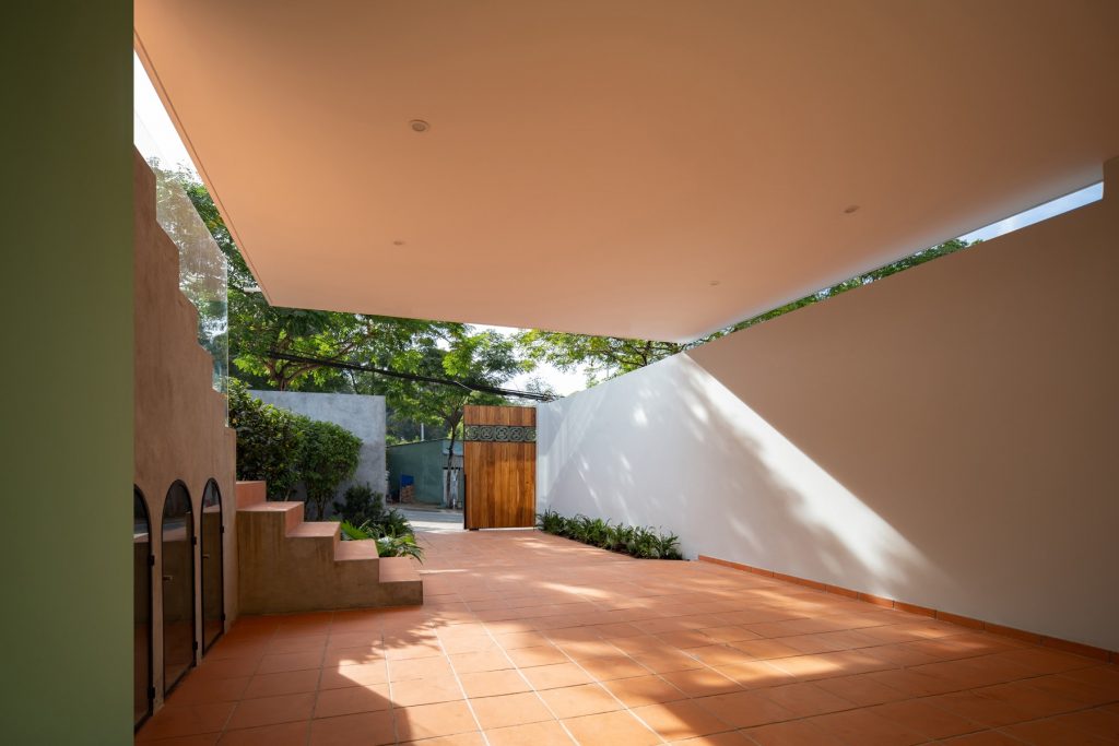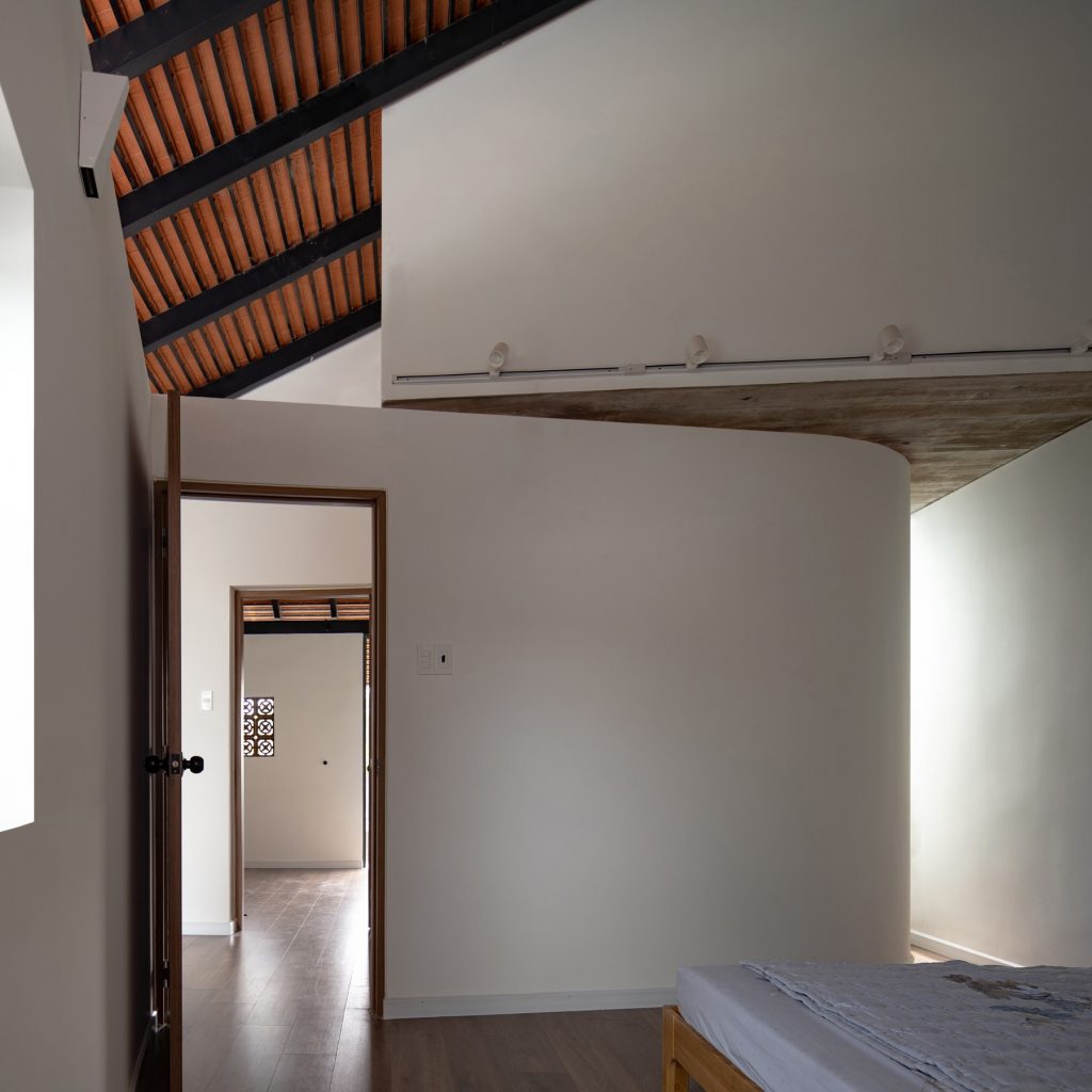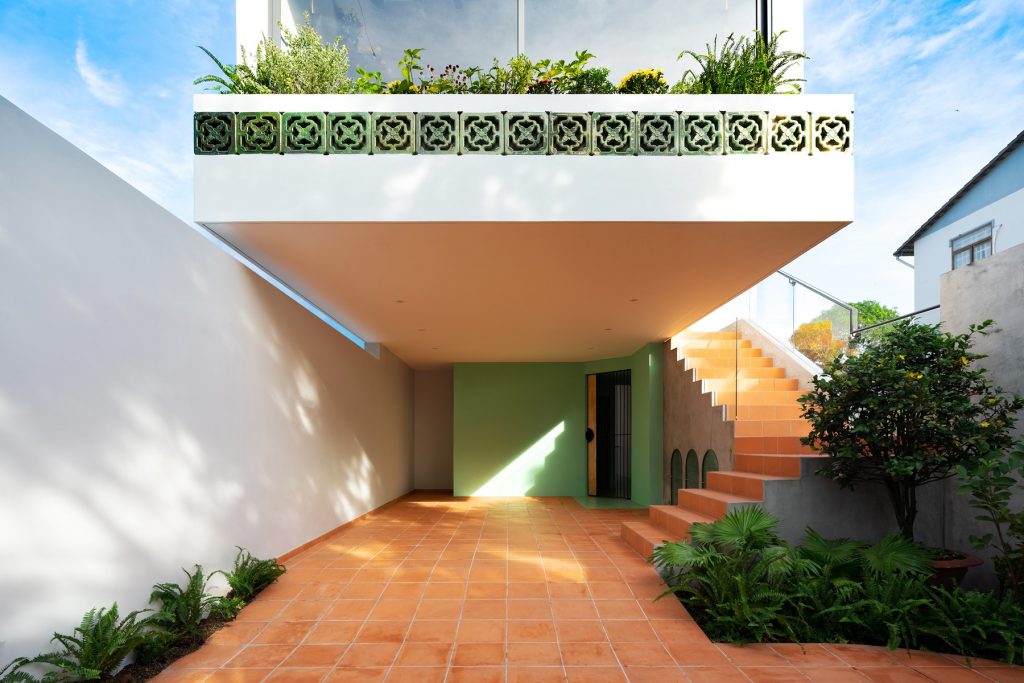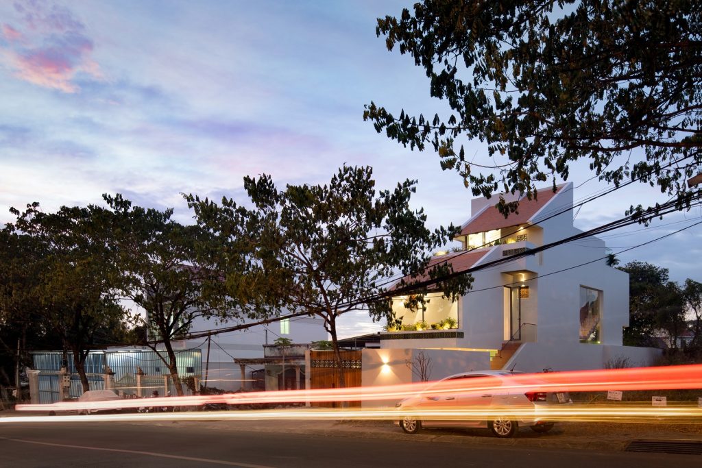 Chiều “nghiêng” cũng được sử dụng khi tổ chức hình khối kiến trúc. Thay cho khối hộp nhà phố với quy mô ba tầng thẳng đứng, thiết kế đẩy lùi khối chức năng phía trên về sau, kết hợp bộ mái ngói. Thủ pháp này nhằm giảm đi sức nặng tổng thể khi nhìn từ mặt đứng. Qua cổng, tiến dần vào bên trong, tầng trên cùng sẽ biến mất, công trình trở về tỉ lệ trệt – lầu, tạo cảm giác thân thiện hơn cho người tiếp cận.