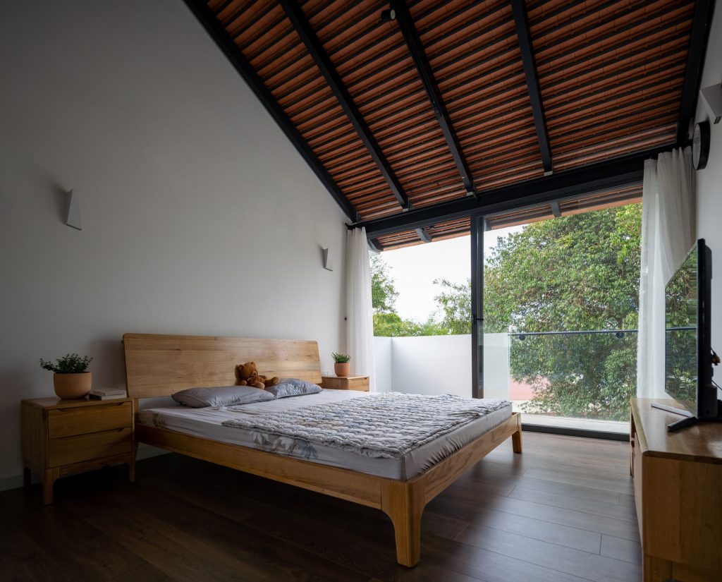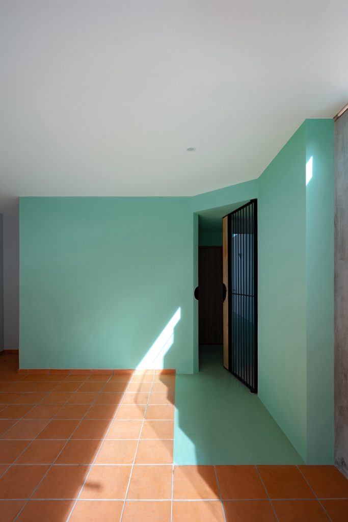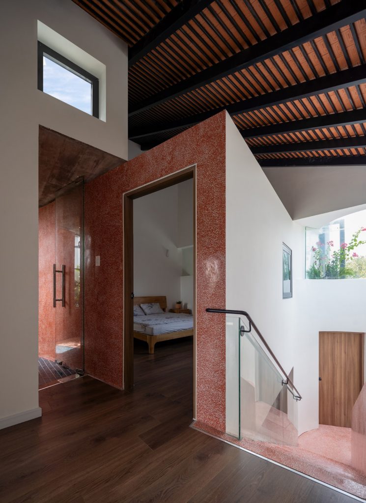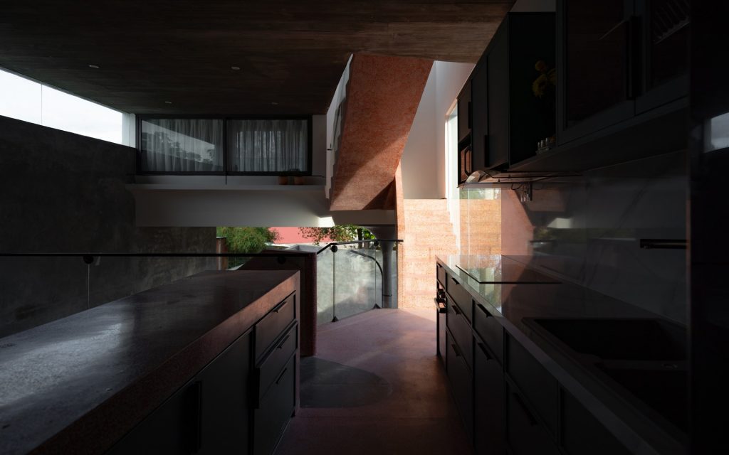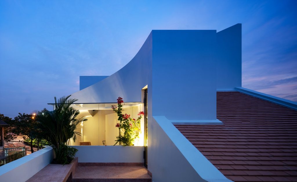 Chiều “nghiêng” cũng được sử dụng khi tổ chức hình khối kiến trúc. Thay cho khối hộp nhà phố với quy mô ba tầng thẳng đứng, thiết kế đẩy lùi khối chức năng phía trên về sau, kết hợp bộ mái ngói. Thủ pháp này nhằm giảm đi sức nặng tổng thể khi nhìn từ mặt đứng. Qua cổng, tiến dần vào bên trong, tầng trên cùng sẽ biến mất, công trình trở về tỉ lệ trệt – lầu, tạo cảm giác thân thiện hơn cho người tiếp cận.