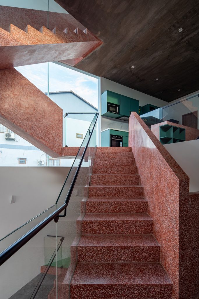Cầu thang này được xử lý sao cho bậc bắt đầu và bậc kết thúc của một vế thang nằm cùng vị trí trên mặt bằng, nhường thêm khoảng trống cho lõi thông tầng. Kết quả tạo ra một cấu trúc linh hoạt nhấn mạnh phương vị “nghiêng” và là điểm nhấn kết nối toàn bộ công trình.