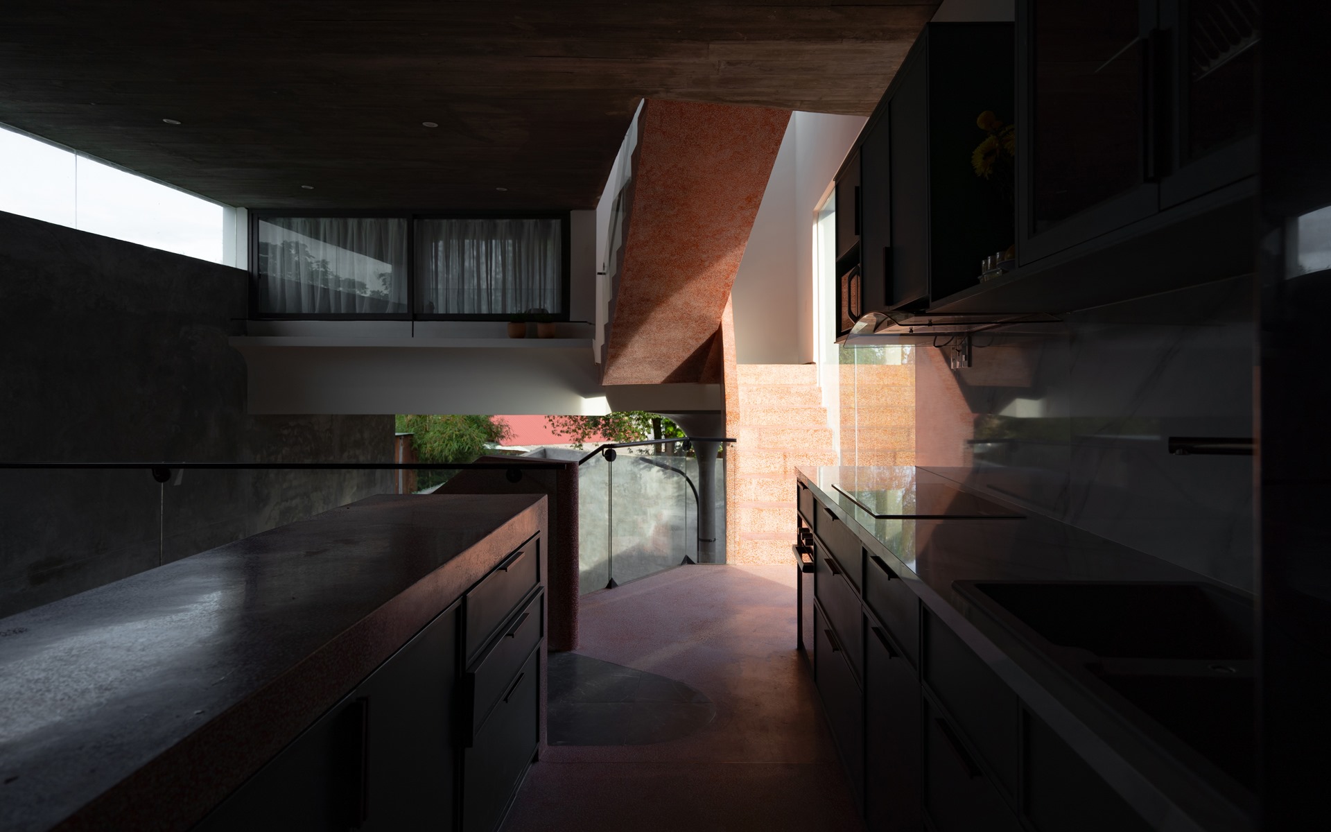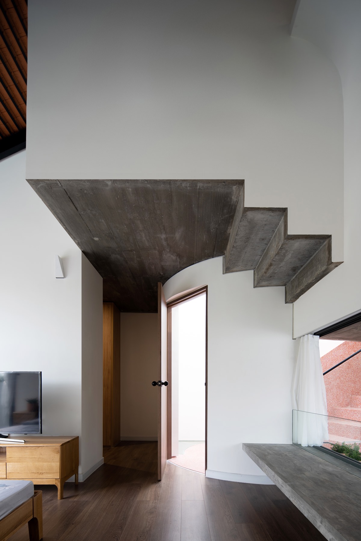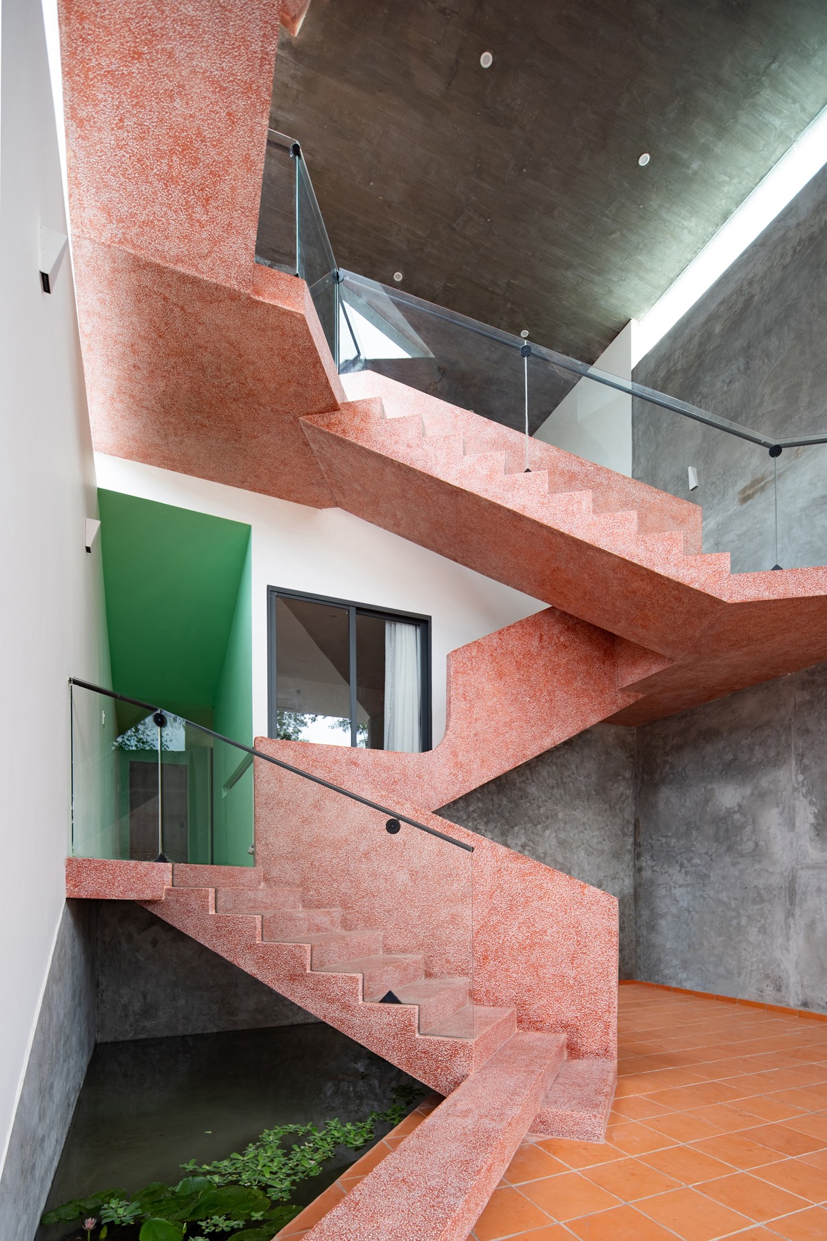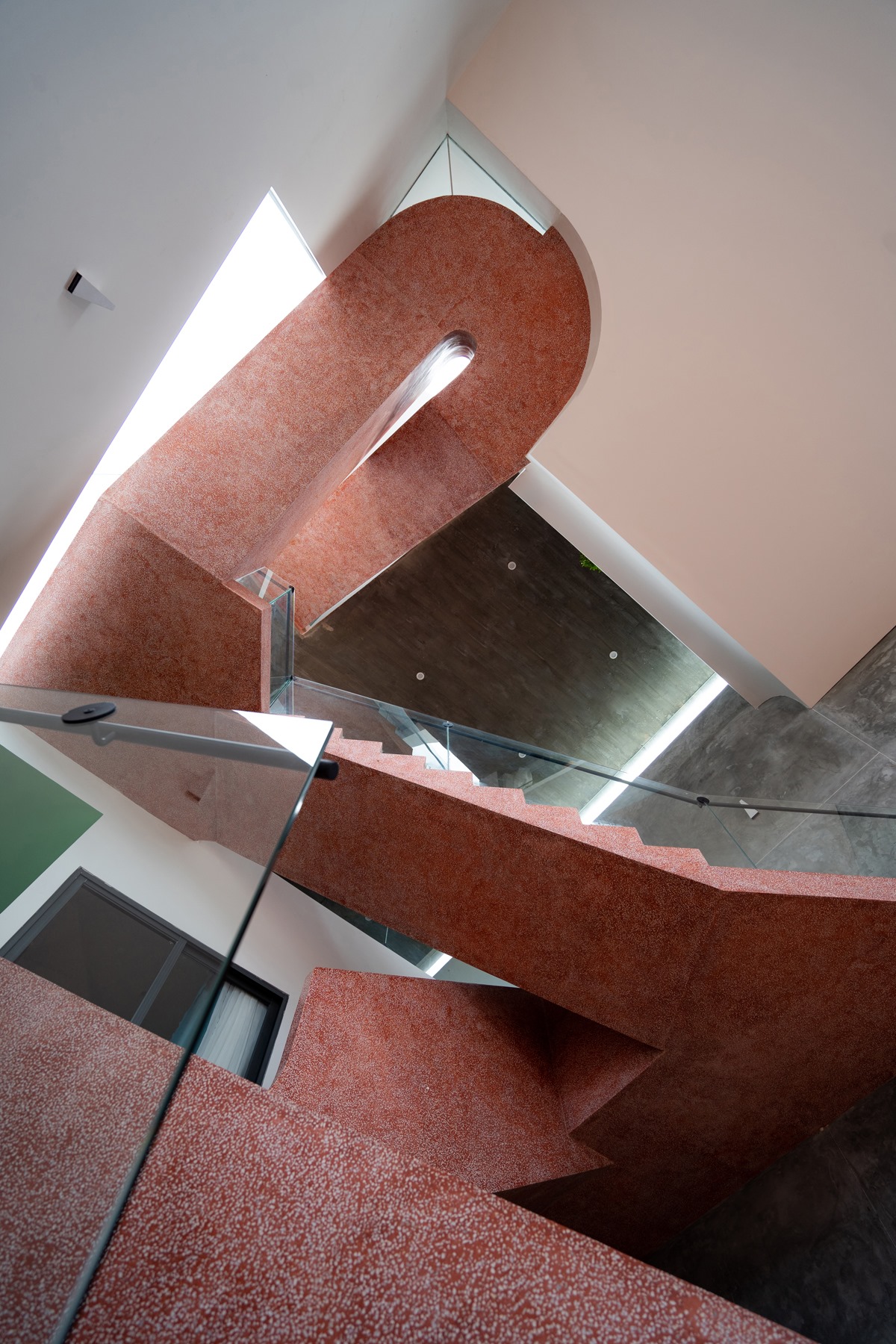 Cầu thang này được xử lý sao cho bậc bắt đầu và bậc kết thúc của một vế thang nằm cùng vị trí trên mặt bằng, nhường thêm khoảng trống cho lõi thông tầng. Kết quả tạo ra một cấu trúc linh hoạt nhấn mạnh phương vị “nghiêng” và là điểm nhấn kết nối toàn bộ công trình.
