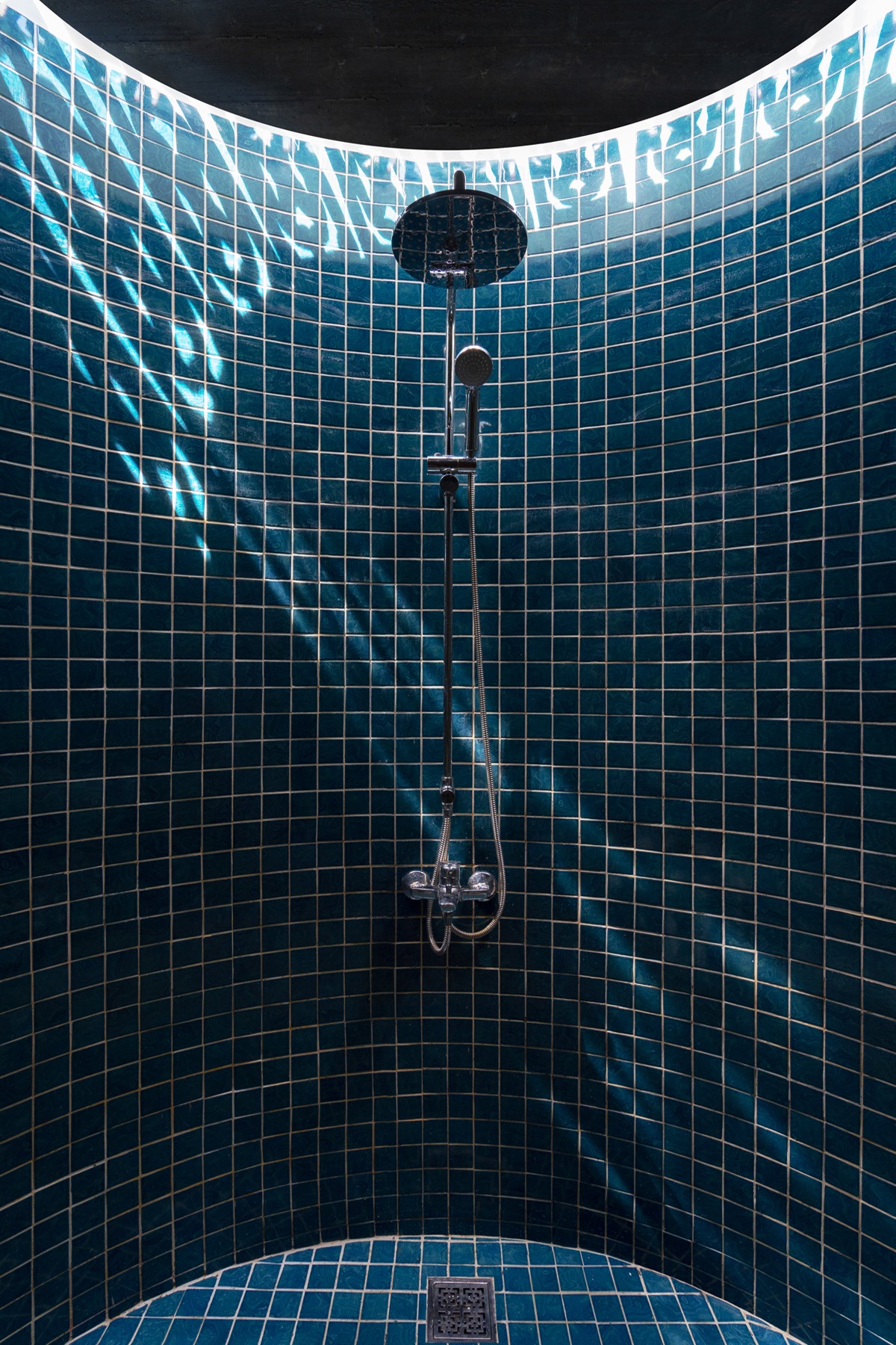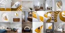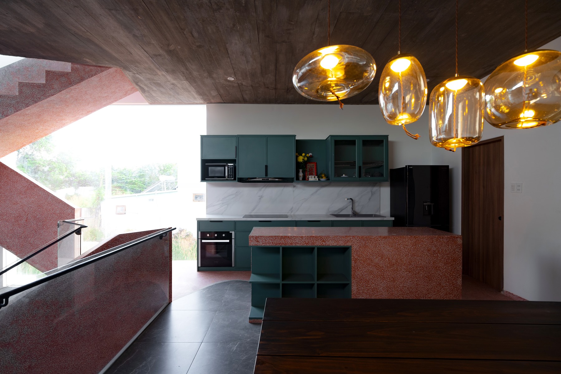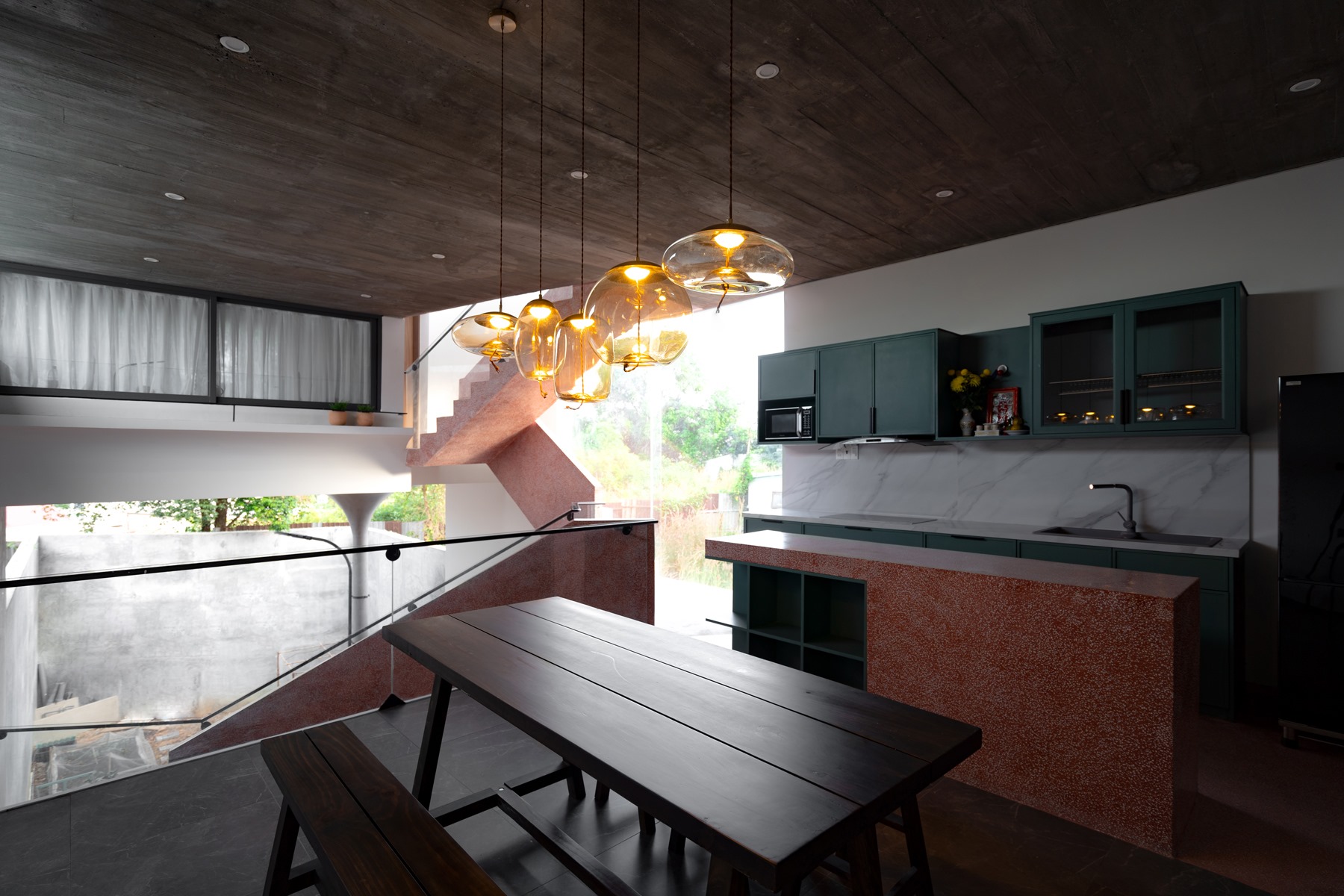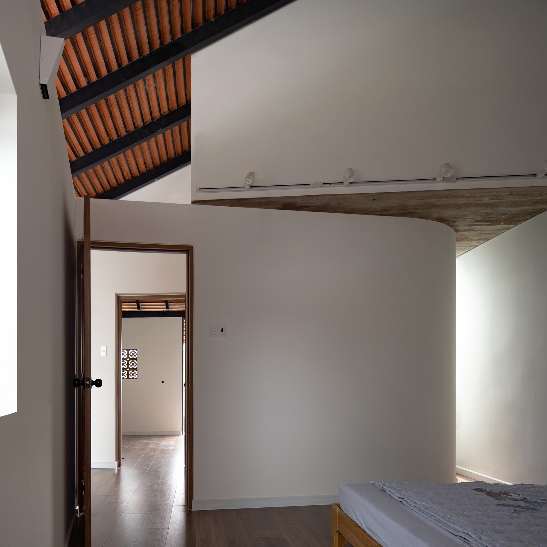 Cầu thang này được xử lý sao cho bậc bắt đầu và bậc kết thúc của một vế thang nằm cùng vị trí trên mặt bằng, nhường thêm khoảng trống cho lõi thông tầng. Kết quả tạo ra một cấu trúc linh hoạt nhấn mạnh phương vị “nghiêng” và là điểm nhấn kết nối toàn bộ công trình.