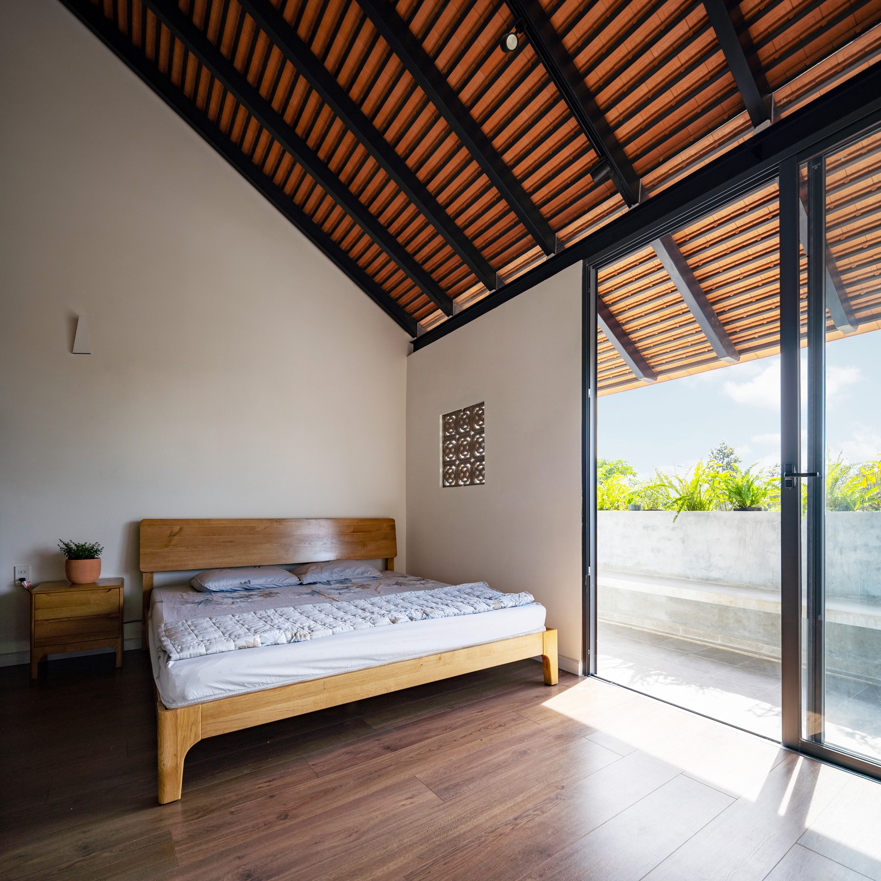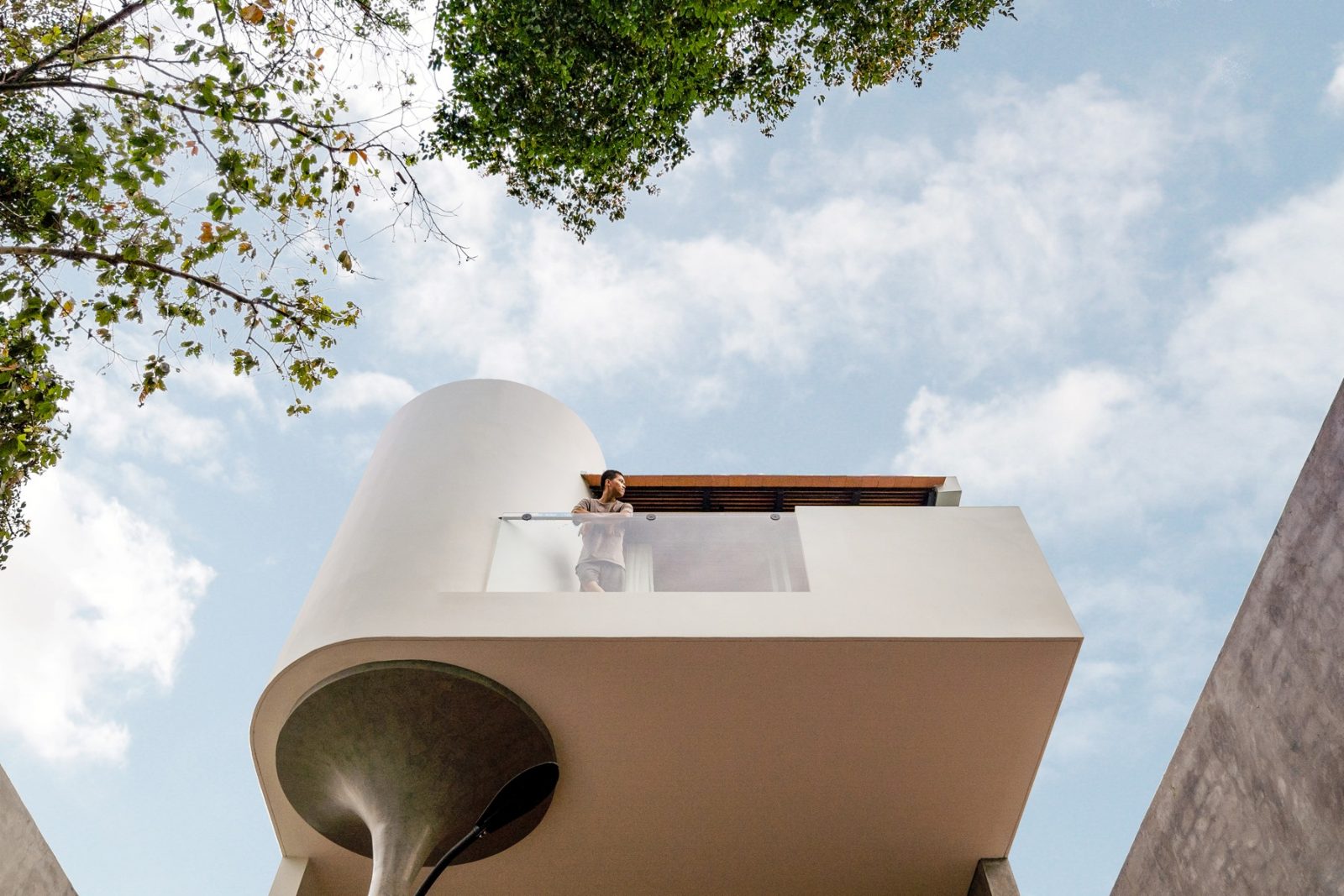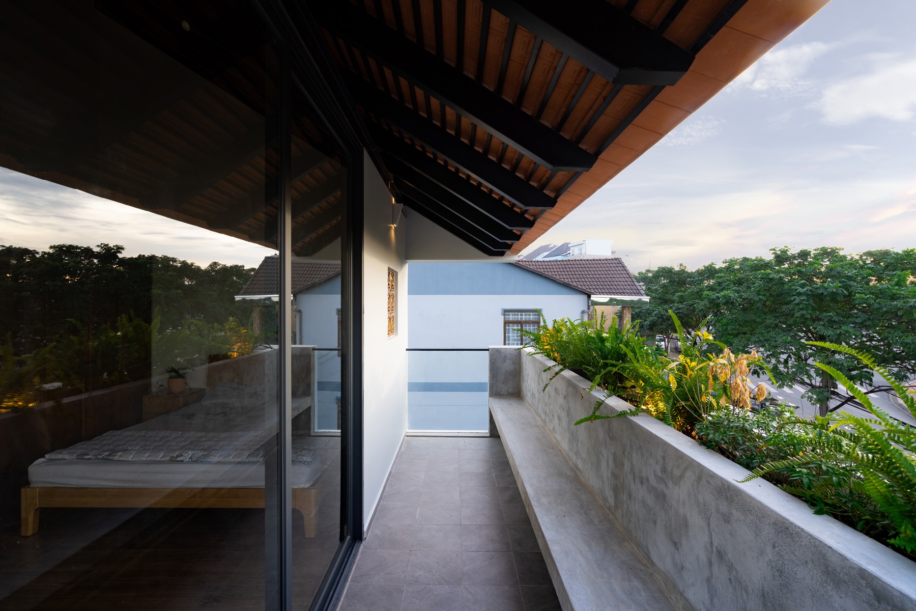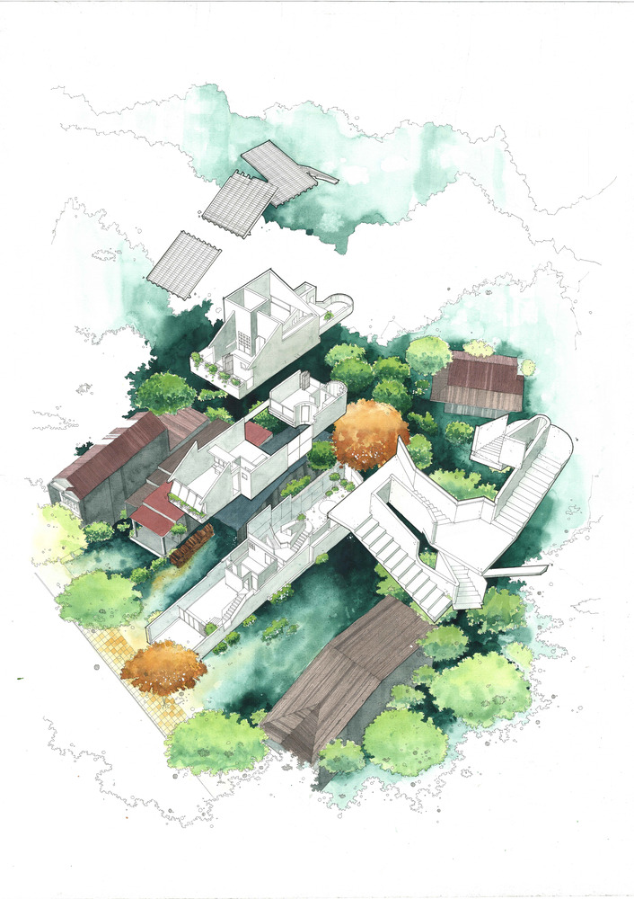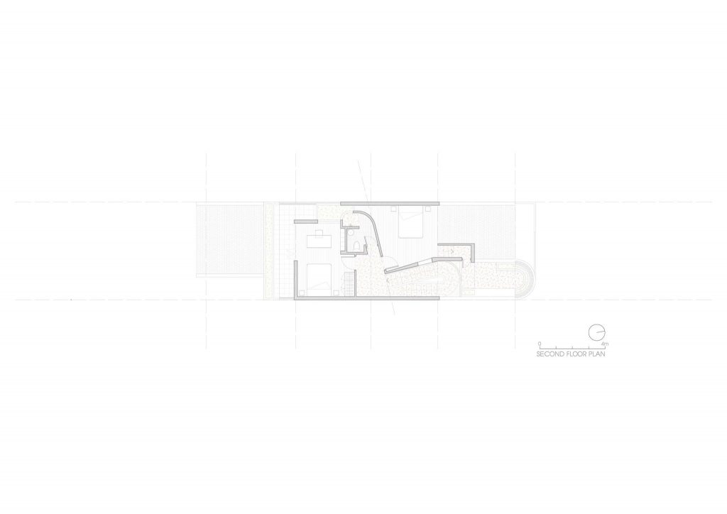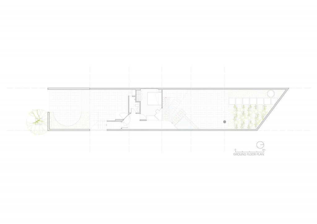 Chiều “nghiêng” cũng được sử dụng khi tổ chức hình khối kiến trúc. Thay cho khối hộp nhà phố với quy mô ba tầng thẳng đứng, thiết kế đẩy lùi khối chức năng phía trên về sau, kết hợp bộ mái ngói. Thủ pháp này nhằm giảm đi sức nặng tổng thể khi nhìn từ mặt đứng. Qua cổng, tiến dần vào bên trong, tầng trên cùng sẽ biến mất, công trình trở về tỉ lệ trệt – lầu, tạo cảm giác thân thiện hơn cho người tiếp cận.