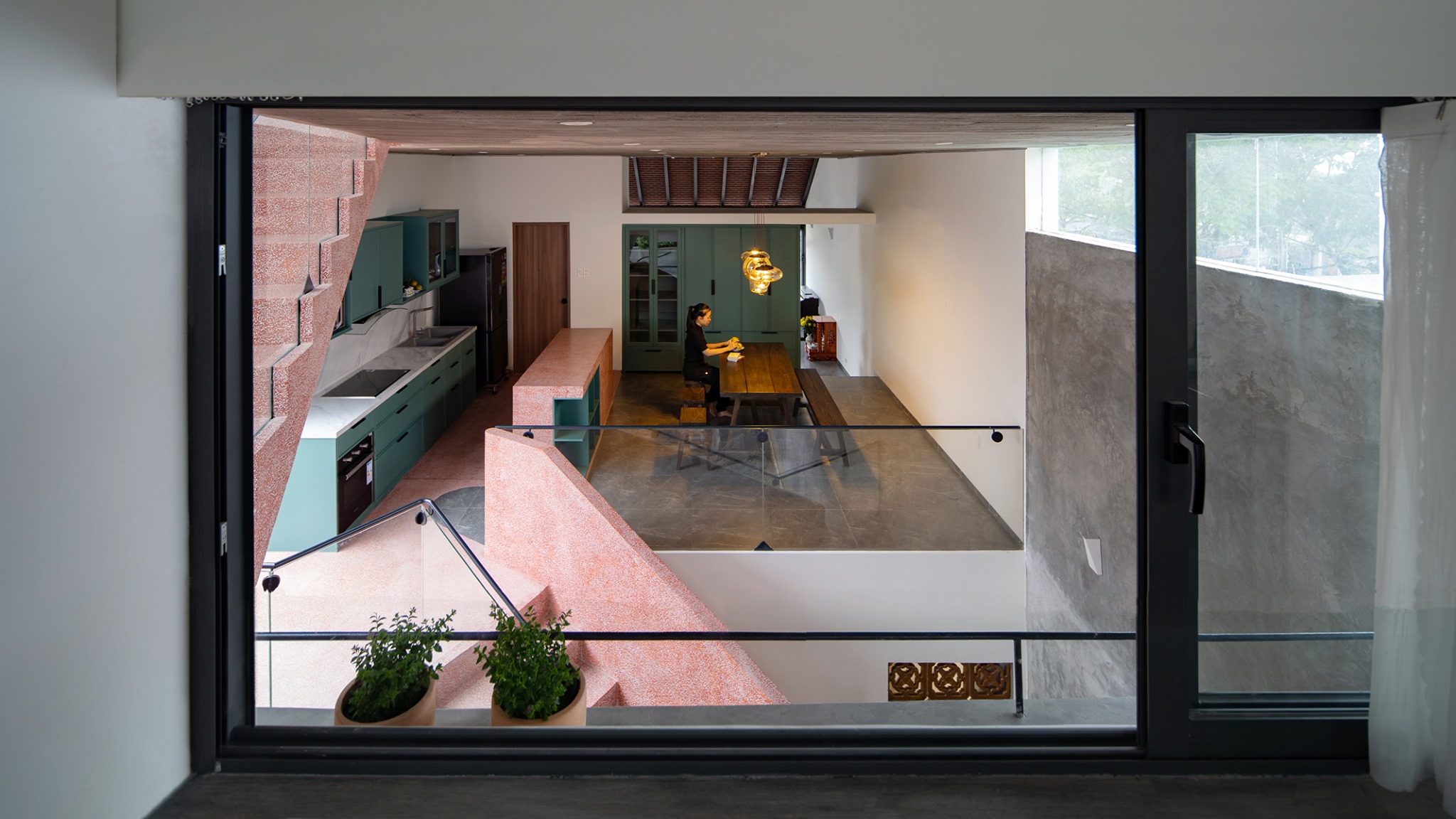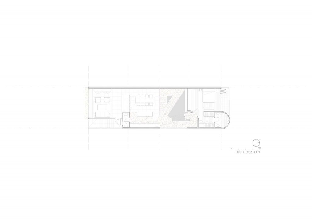 Căn nhà được chia làm hai phần theo phương đứng, tiếp cận bởi hai cầu thang riêng biệt. Cầu thang phía trước dành cho không gian chung, từ garage dẫn lên phòng khách. Cầu thang phía sau dành cho không gian gia đình, nơi mọi thành viên sẽ ngang qua thăm ông mỗi khi về nhà, trước khi từ đây dẫn về các không gian khác.