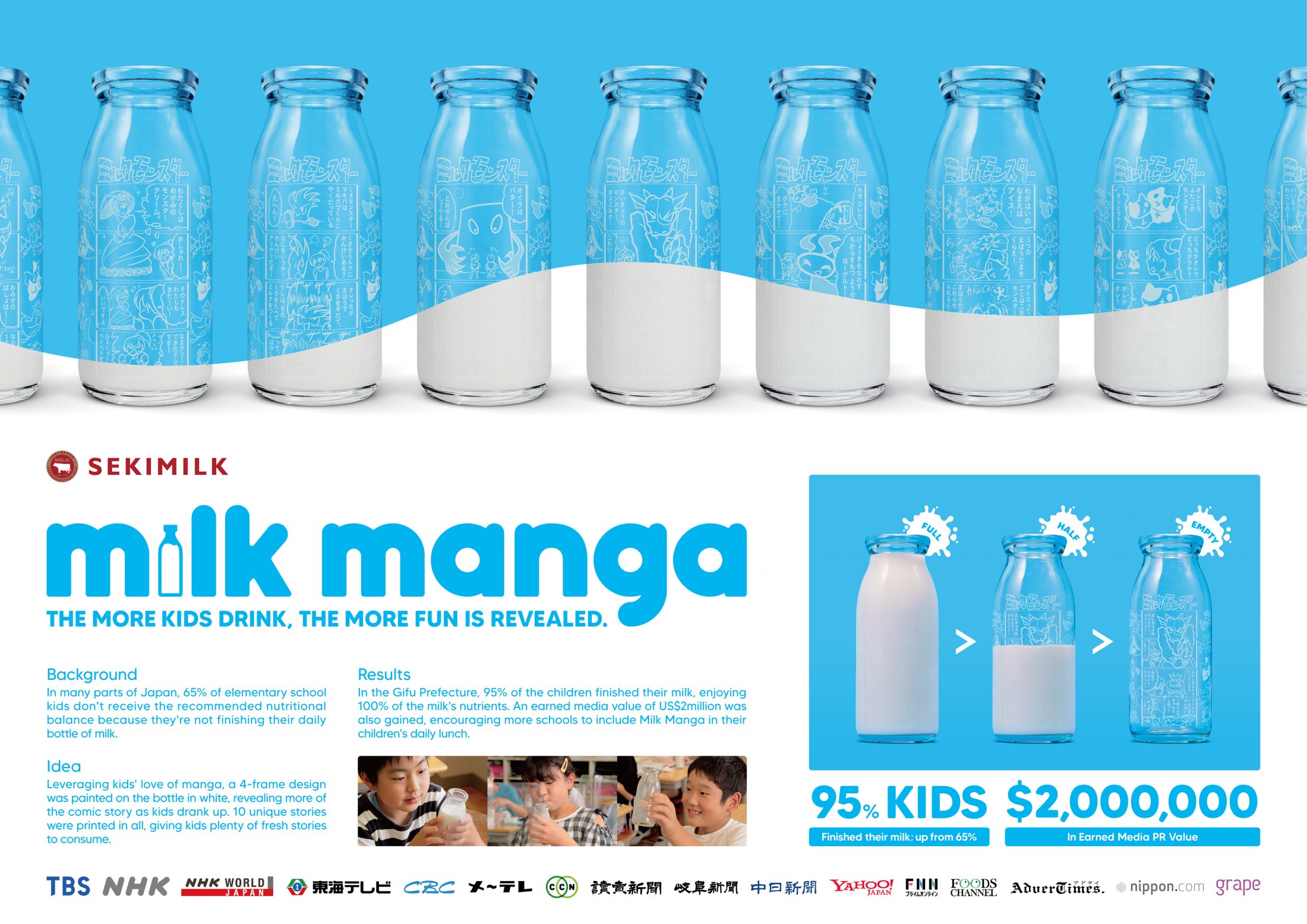 Với mong muốn cải thiện điều này, thương hiệu sữa Seki Milk của xứ sở hoa anh đào đã phát động một chiến dịch độc đáo có tên Milk Manga, biến chính những chai sữa thành phương tiện đọc truyện tranh đồng thời khuyến khích trẻ uống hết khẩu phần sữa của mình.