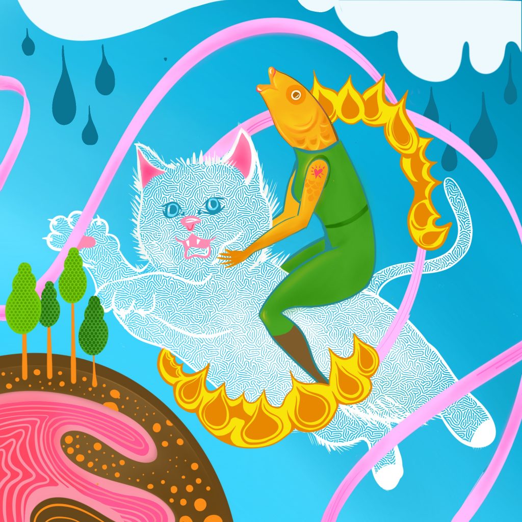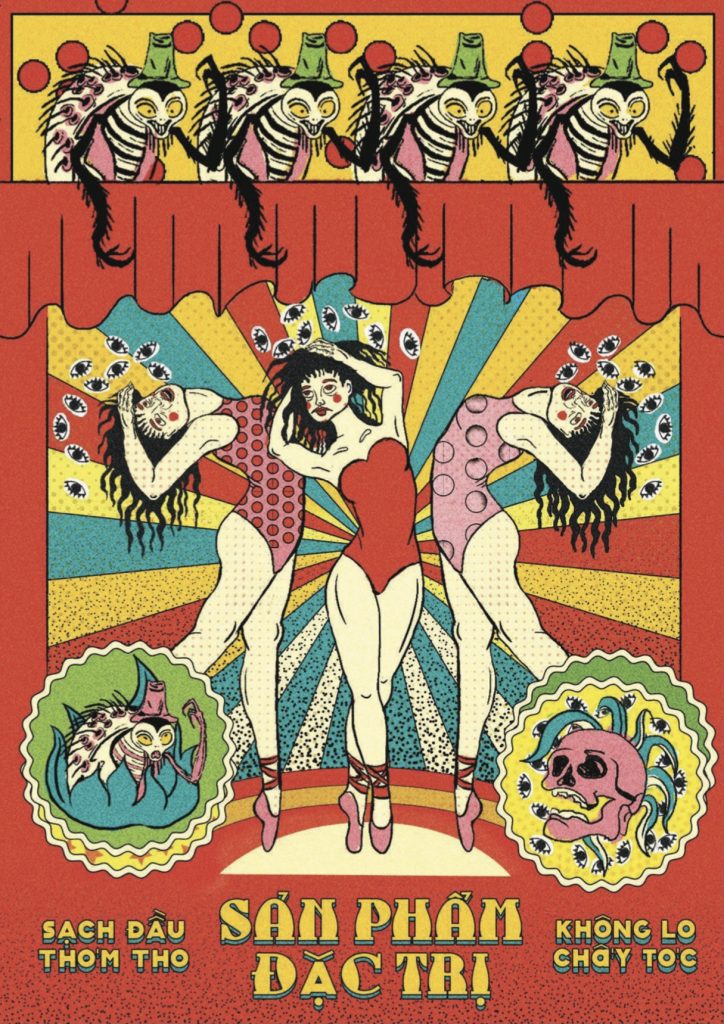 Đúng là giai đoạn gần đây Thanh đã chủ ý sử dụng màu có độ saturation (sắc độ) cao, đôi khi là chói nữa. Từ khóa của Thanh cho giai đoạn này là “contrast: sự tương phản” vì Thanh luôn quan tâm đến hai mặt của chủ đề, đôi khi Thanh muốn đẩy hai phía đến cực điểm. Thanh chia sẻ thêm vài điểm chung của các tranh là ngoài về màu sắc, các elements (yếu tố) Thanh dùng cũng rất nhiều, tràn đều tranh với nhiều kiểu pattern (họa tiết) khác nhau.