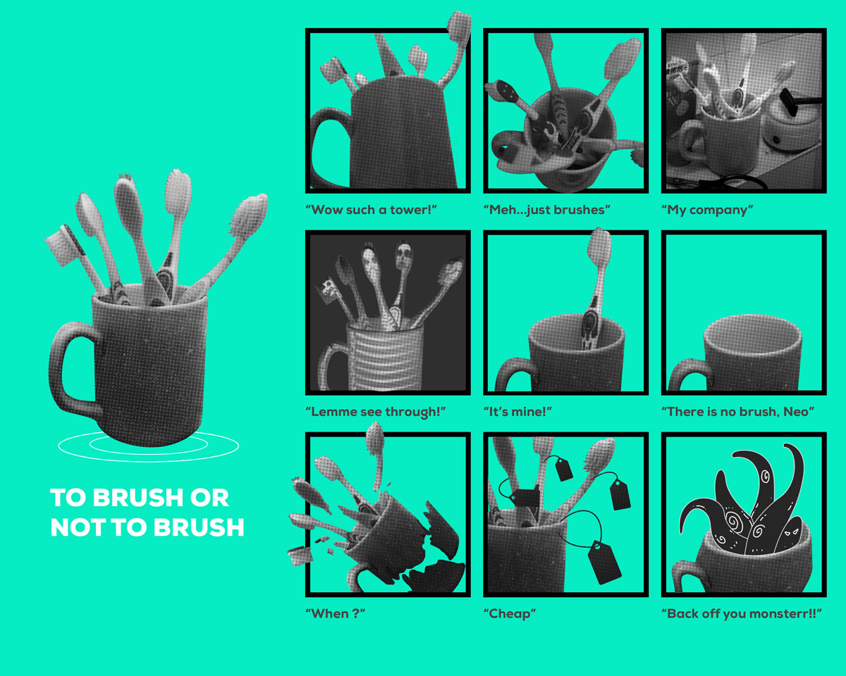 Lấy ý tưởng từ chiếc cốc đựng bàn chải và những chiếc bàn chải đánh răng trong nó. Nguyễn Minh Ngọc đã thể hiện chúng qua 09 cách nhìn khác nhau nhằm khai thác sâu hơn về hình dáng, chất liệu, tính năng cứng – mềm, đặc – linh hoạt,……. của những đồ vật quen thuộc xung quanh ta.