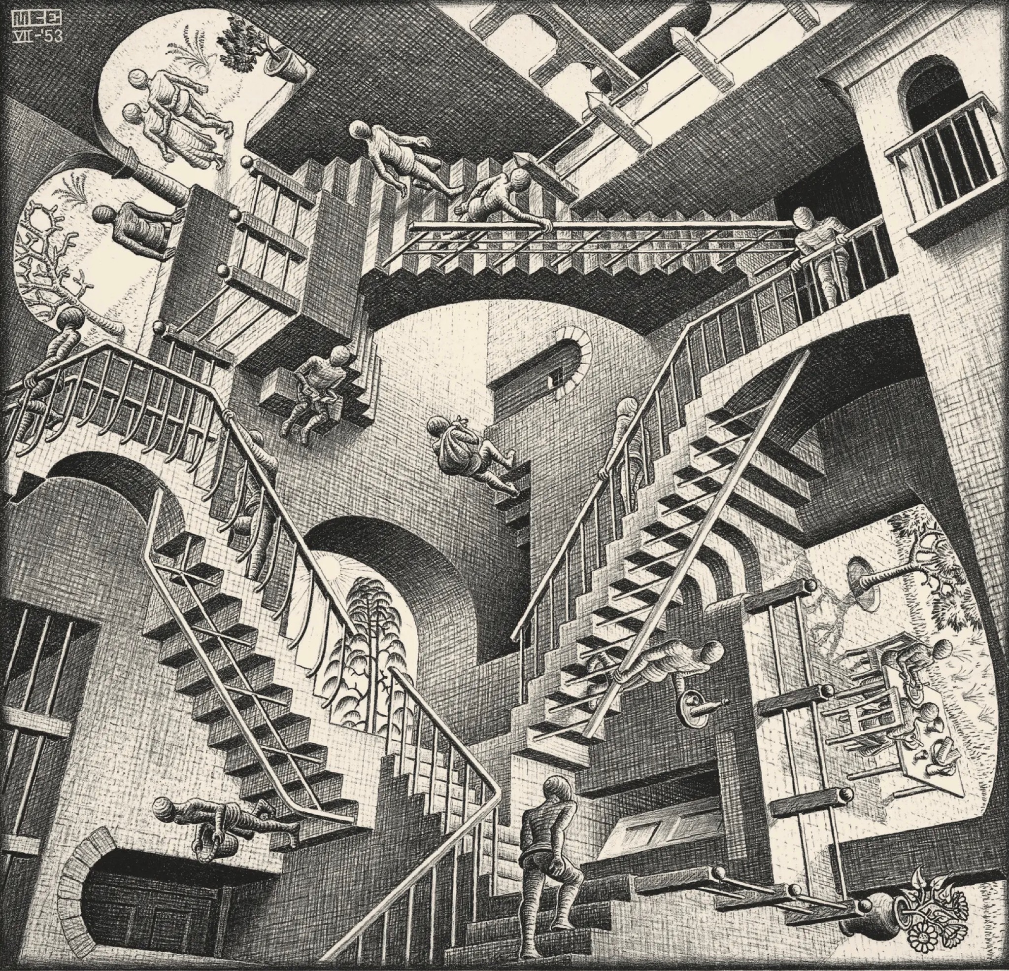 Đối với những người mê trò chơi điện tử khi thấy những bậc thang này có thể sẽ liên tưởng ngay đến tựa game Monument Valley, fan kiến trúc thì sẽ nhớ đến “pháo đài” đỏ La Muralla Roja, còn các “con nghiện” Harry Potter sẽ nghĩ đến các cầu thang dịch chuyển trong trường Hogwarts. Tuy nhiên, thực tế thì cảnh cầu thang trong phim được lấy cảm hứng từ bức tranh nổi tiếng Relativity của danh hoạ người Hà Lan M.C. Escher. Bức tranh gốc thể hiện suy nghĩ của ông về một thế giới không trọng lực. Việc sử dụng ý tưởng này cũng ngầm cho thấy rằng trong thế giới của Squid Game thì các quy tắc và thói quen của thế giới thực không được áp dụng.