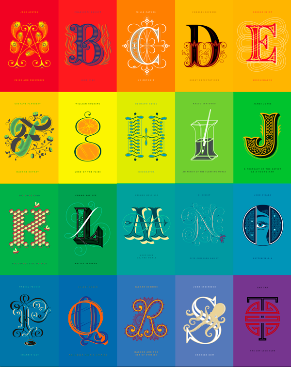 Penguin Drop Caps là một loạt 26 tác phẩm bìa cứng, mỗi tác phẩm là những ký tự được minh họa đặc biệt, lấy cảm hứng từ những tác phẩm văn học nổi tiếng. Đây là sự hợp tác giữa Jessica Hische và giám đốc nghệ thuật của Penguin: Paul Buckley. Hai mươi sáu cuốn sách được làm theo phong cách rainbow-hued. Penguin Drop Caps ra mắt “A” cho ” Kiêu hãnh và định kiến ” của Jane Austen, “B” với ” Jane Eyre ” của Charlotte Brontë, “C” với tác phẩm ” Ántonia của tôi ” của tác giả Willa Cather, và còn tiếp tục với nhiều tác phẩm kinh điển của Penguin. Cùng RGB thưởng thức nhé!