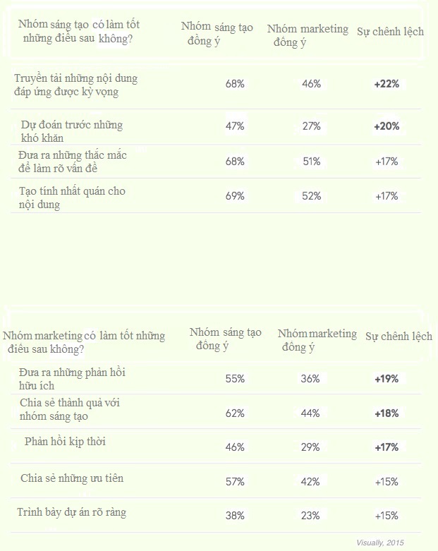 Theo một báo cáo mới nhất từ Visually về mối quan hệ giữa 2 bộ phận là marketing và bộ phận sáng tạo: nhóm này thường tự đánh giá bản thân cao hơn những gì nhóm kia nhận xét về mình, đặc biệt khi xét đến những khía cạnh như sự truyền tải nội dung cuối có đáp ứng được kỳ vọng không, những phản hồi đưa ra có hữu ích không.