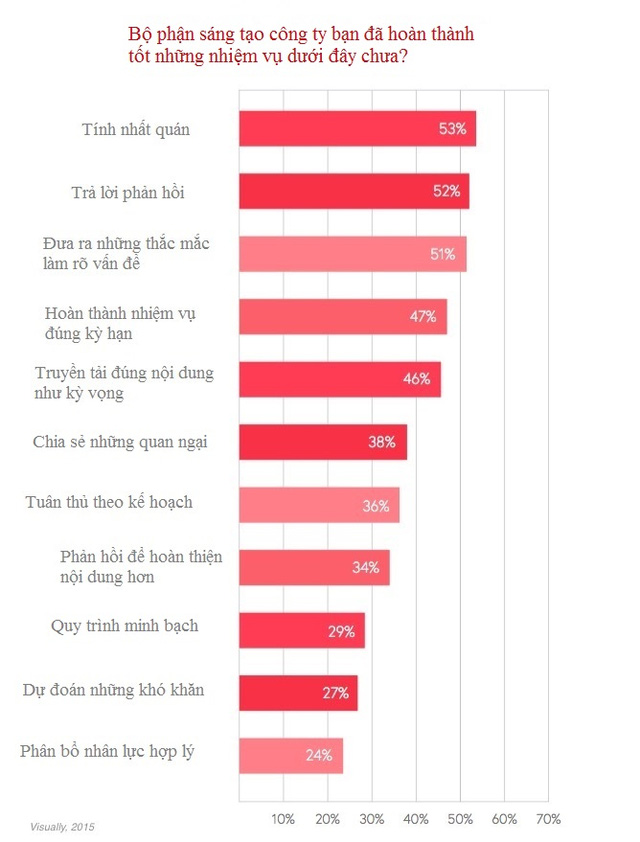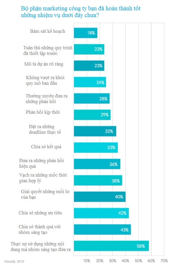 Tuy nhiên, chưa tới 1/3 các marketer cho rằng nhóm sáng tạo đạt thành công trong việc minh bạch (29%), dự đoán rắc rối (27%), và phân bổ nhân lực hợp lý (24%).