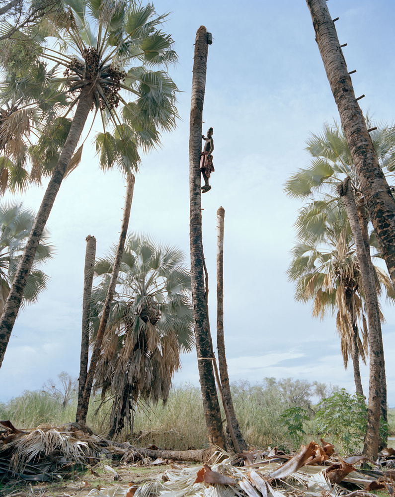 “Tôi chụp series 8 bức ảnh này vào năm 2015 trên chuyến trở về vùng Kunene của Namibia. Tôi đã du lịch đến vùng đất này để trò chuyện với thành viên của dự án Chân dung người trẻ Ovahimba. Một người đàn ông Himba trẻ tên Wakarerena Tjondu mà tôi từng gặp vào năm 2014, dẫn tôi đi qua những rừng cọ và tự hào giới thiệu với tôi về quy trình khai thác cọ.