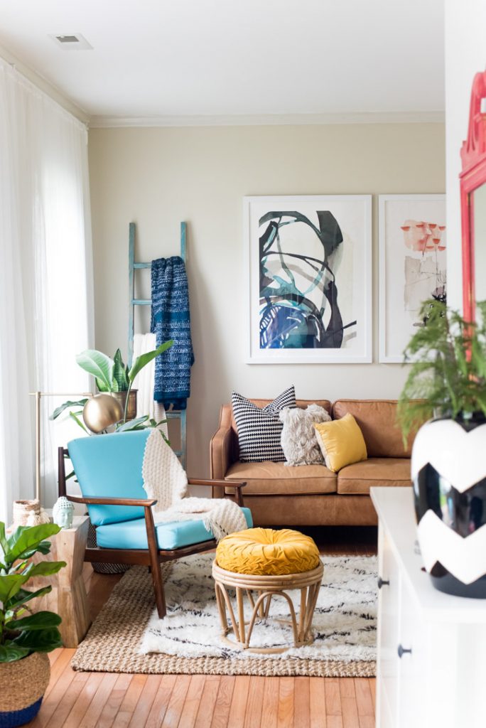 - Thay vì những miếng vải bọc màu sắc lớn, hãy tạo ra những điểm nhấn; ví dụ như một bức tượng nhỏ gỉ sét hay bình đất nung.