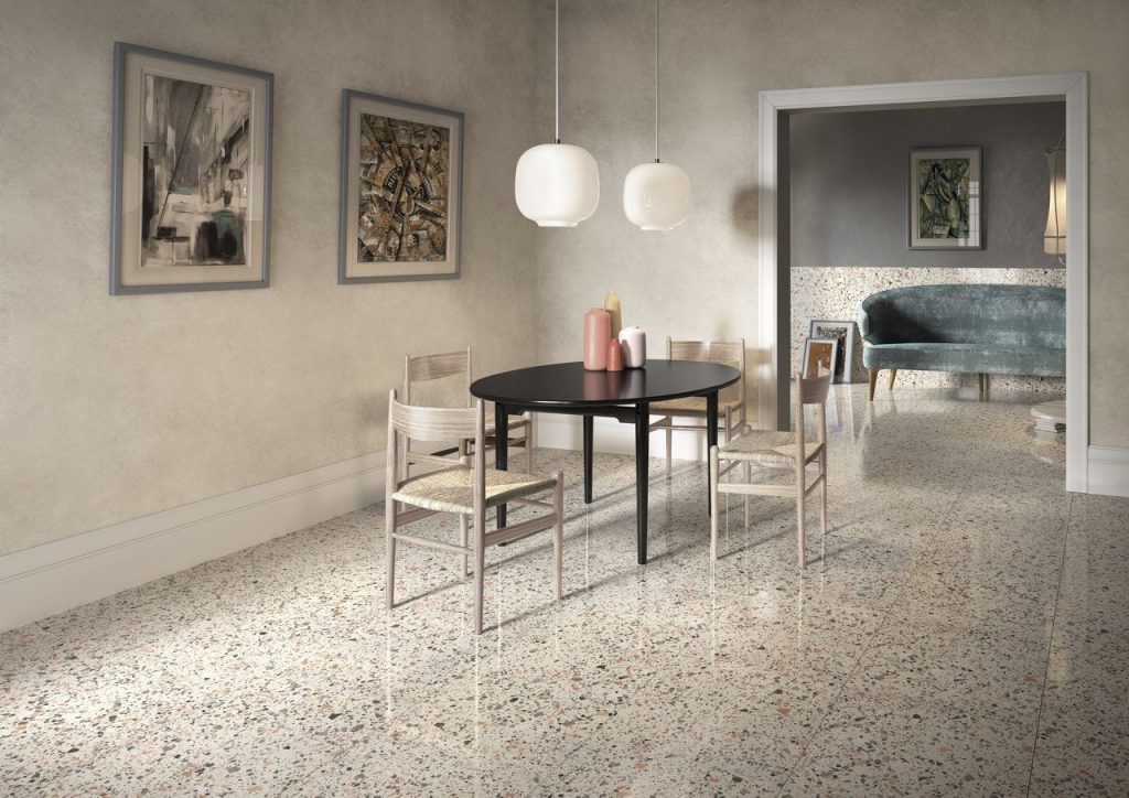 Gạch trang trí hình xương cá (Herringbone-Inspired Pattern) thay thế cho Gạch bông đá mài (Terrazzo Tile)