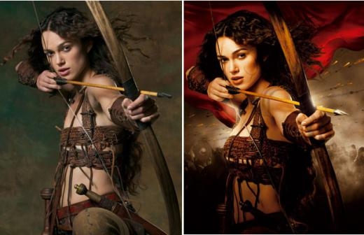Keira Knightley trong hình poster phim King Arthur phiển bản Anh Quốc (trái) và phiên bản Mỹ (phải) đã được chỉnh sửa bắt mắt hơn.