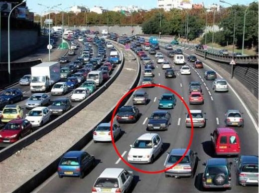 Bức ảnh cho thấy giao thông tắc nghẽn ở ngoại ô Paris. Ai đó đã “photoshop” một số người lái xe đi ngược lên lên lề trái của đường cao tốc.