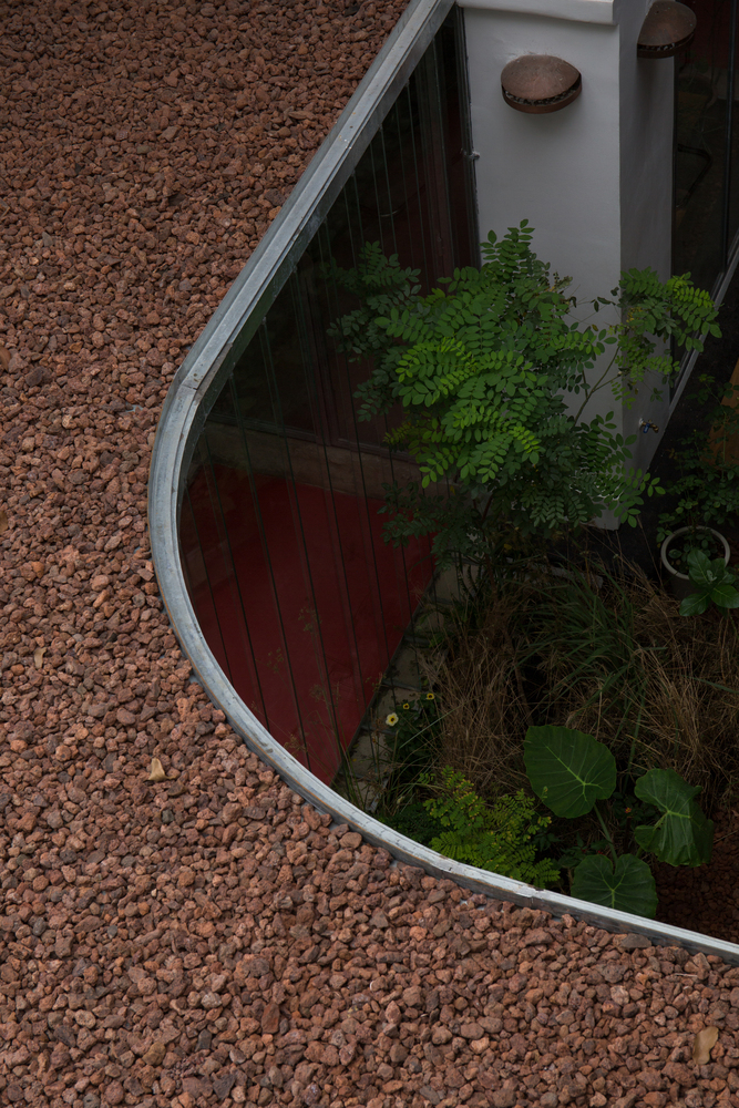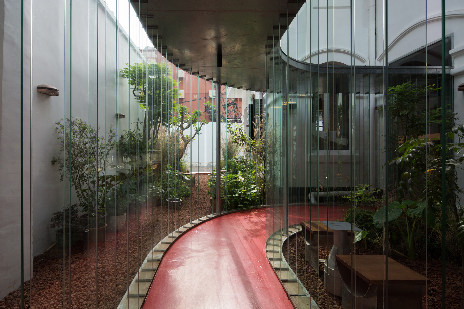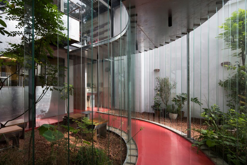 Sân vườn là vùng đệm giữa khu biệt thự cũ và khu nhà mới. Lối đi chia thành hai phần: hiên và sân trong. Những tấm kính chắn dọc lối đi phân định tinh tế giữa bên trong và bên ngoài. Chúng hấp thụ, phản xạ cả ánh sáng và môi trường xung quanh. Sàn epoxy màu đỏ thu hút sự chú ý của mọi người từ trước ra sau. Ở phía sau của tầng hai, tầm nhìn đột nhiên được mở rộng, bao gồm toàn bộ khu vườn và môi trường xung quanh.