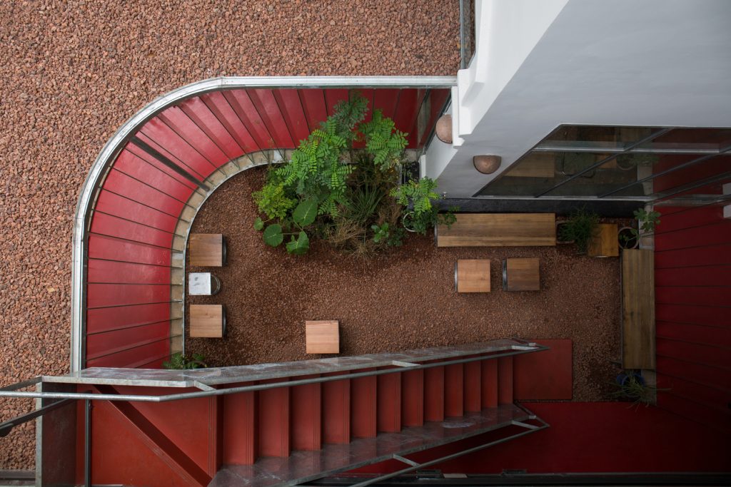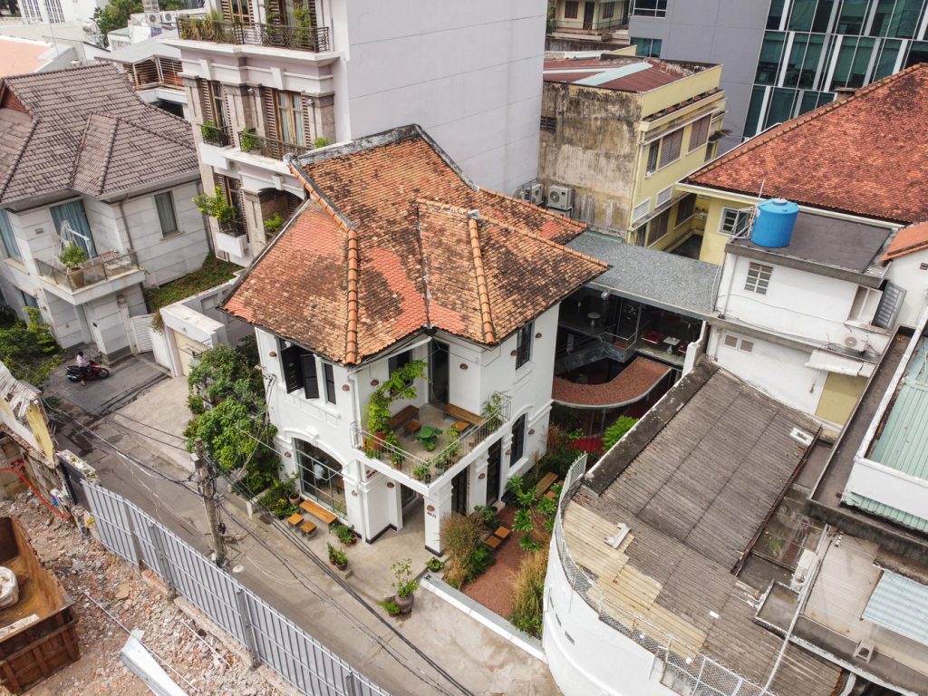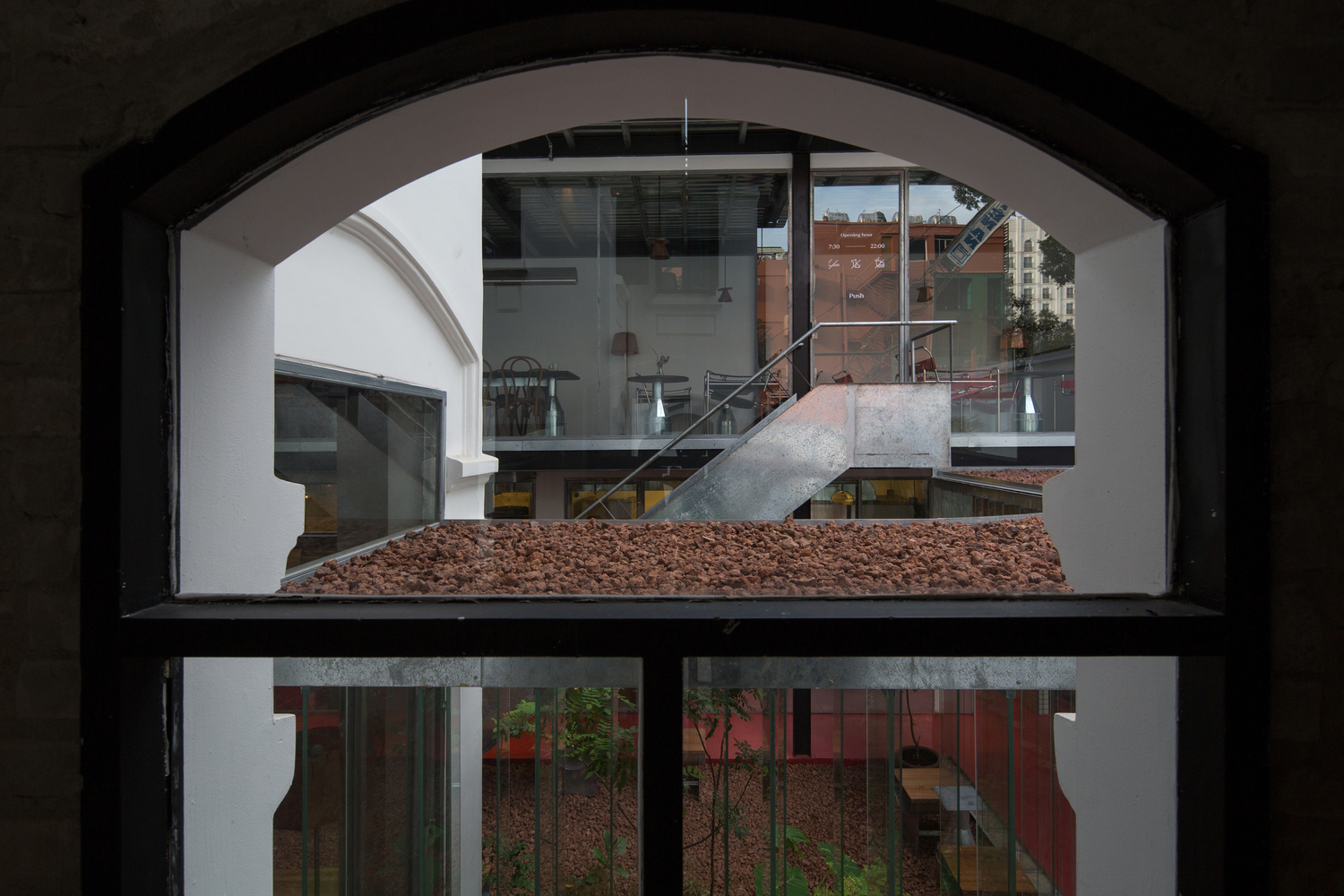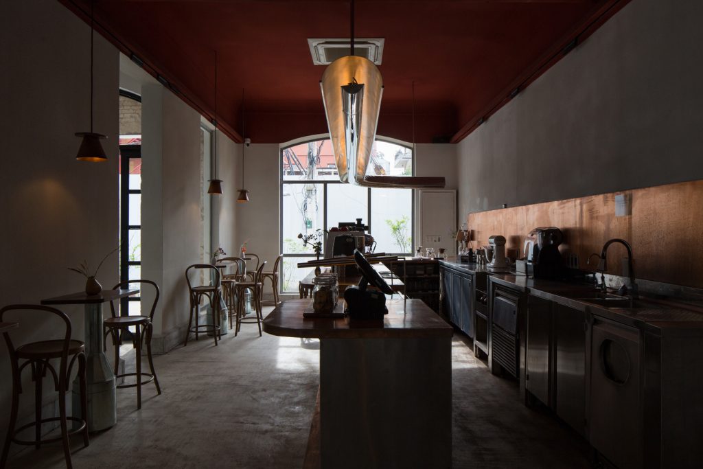Không gian quán là một cuộc đối thoại liên tục giữa cái cũ và cái mới thể hiện rõ qua các điểm giao nhau: ở ranh giới giữa các tòa nhà và bối cảnh; qua lối đi từ khu biệt thự cũ sang khu nhà mới; giữa bức tường gạch cũ màu xám và kết cấu cát được sơn tường mới; thép mạ kẽm thô thay cho các khung cửa sổ, khung cửa, tay vịn ban công cũ bị hỏng.
