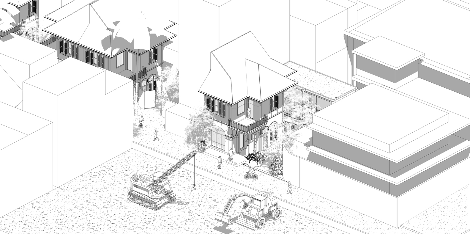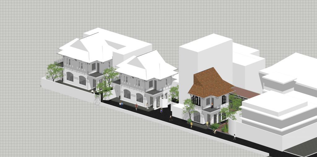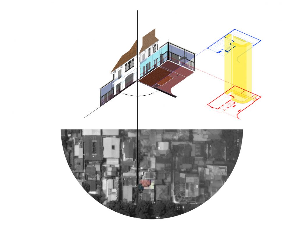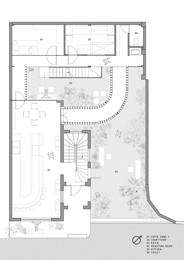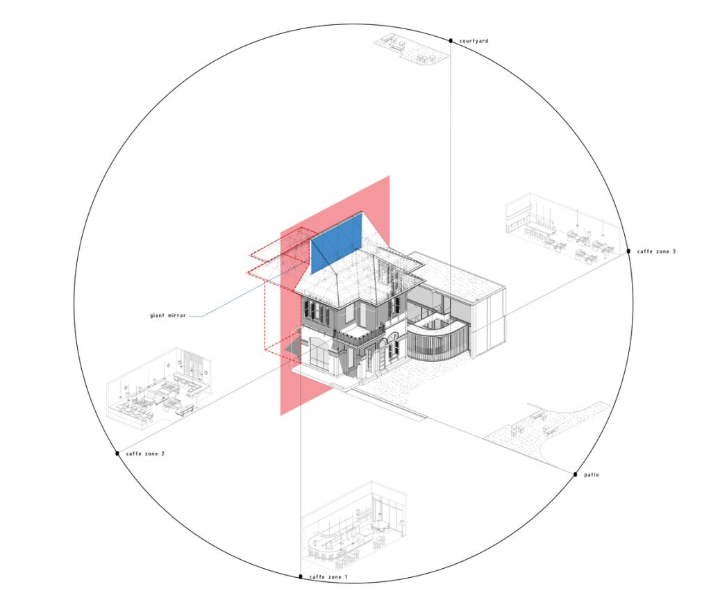 Không gian quán là một cuộc đối thoại liên tục giữa cái cũ và cái mới thể hiện rõ qua các điểm giao nhau: ở ranh giới giữa các tòa nhà và bối cảnh; qua lối đi từ khu biệt thự cũ sang khu nhà mới; giữa bức tường gạch cũ màu xám và kết cấu cát được sơn tường mới; thép mạ kẽm thô thay cho các khung cửa sổ, khung cửa, tay vịn ban công cũ bị hỏng.