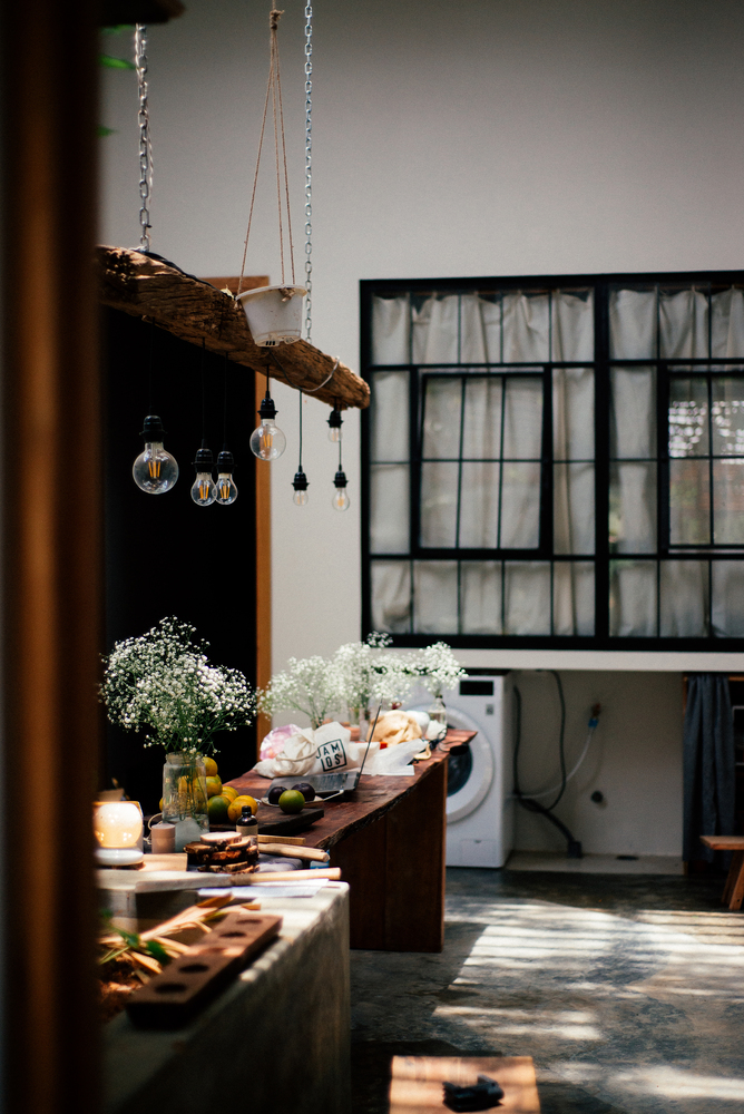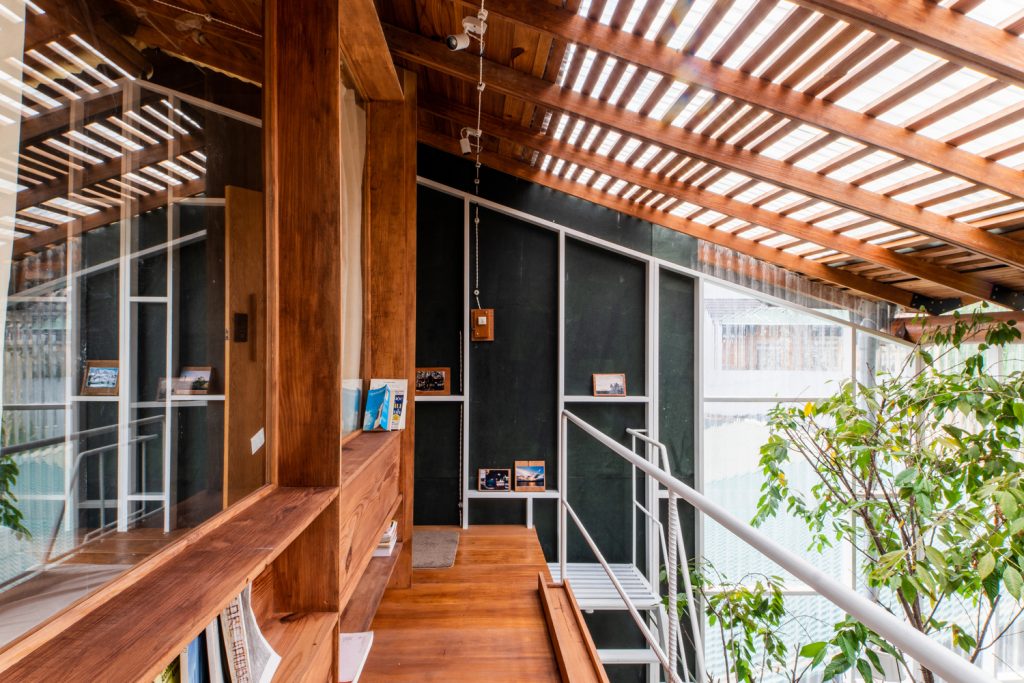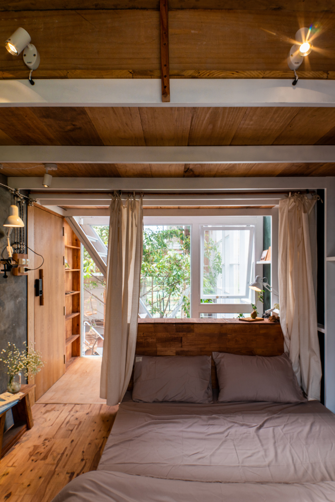 Tất cả các phòng đều được kết nối với sân vườn bằng một cửa sổ lớn giúp tạo ra một không gian linh hoạt, có thể thay đổi công năng dễ dàng tùy theo nhu cầu của người sử dụng. Bạn có thể tìm một góc nhỏ bên chiếc bàn gỗ dài để lặng lẽ ngắm nhìn bầu trời sau những tán cây hoa vàng đung đưa trong gió.