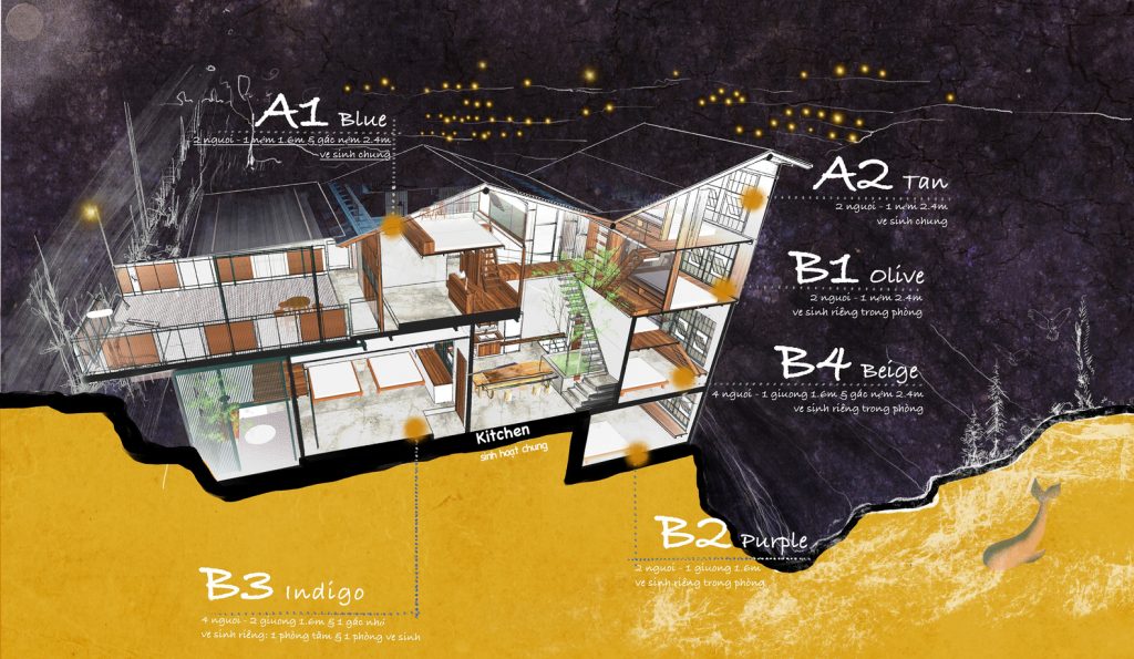 Mục đích của dự án là tạo điểm dừng chân cho khách du lịch, các phòng được thiết kế với diện tích không gian phù hợp, nội thất tối giản, không khí phù hợp cho việc lưu trú tạm thời. Các chức năng tổng thể của homestay đảm bảo khía cạnh thiết thực, đáp ứng các hoạt động hàng ngày của du khách. Hầu hết các đồ nội thất, khung chính và tường của ngôi nhà đều được làm bằng gỗ thông. Du khách có thể có một giấc ngủ ngon trong bầu không khí ấm cúng và êm dịu này.