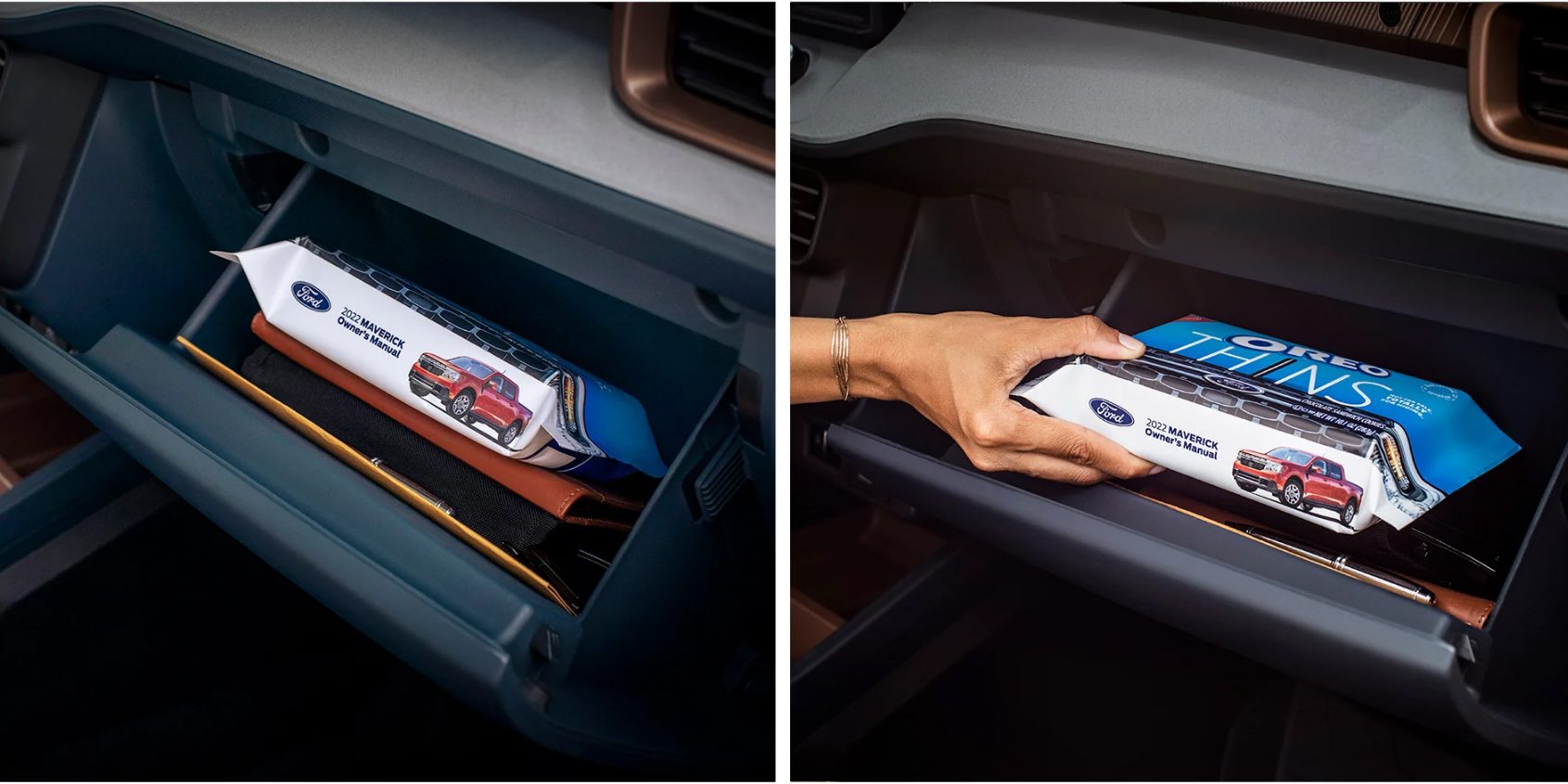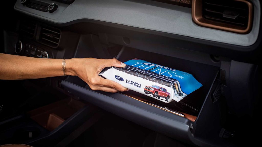 Đối với những người thích ăn vặt khi di chuyển, hãy lấy gói Ford, được ngụy trang dưới dạng sách hướng dẫn lái xe, cất chúng vào hộp tiện lợi trên xe.