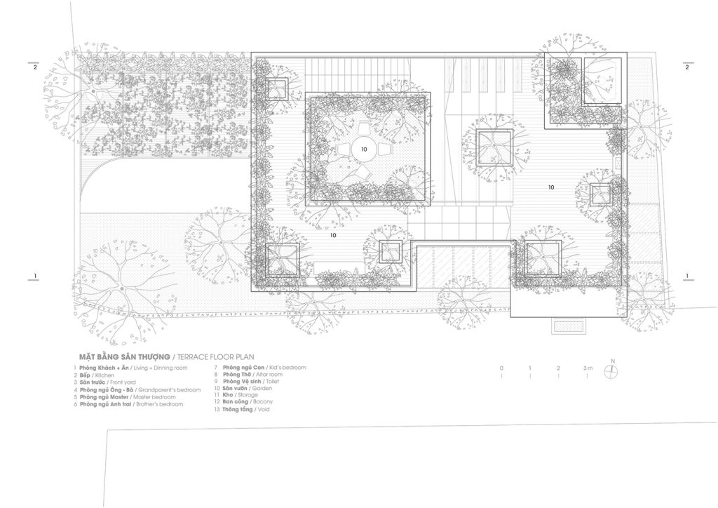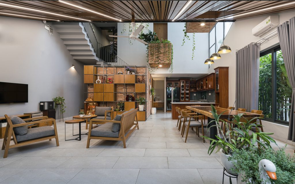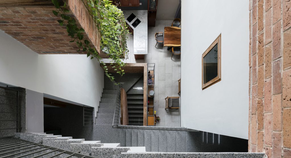 Các ngăn ban công được nhấn bằng gạch đỏ giống các thùng đựng thực vật lớn nhỏ. Chúng được sắp xếp theo một trật tự không định hướng và diễn ra ở nhiều nơi trong nhà cho các hoạt động trồng cây thiết thực. Bằng cách này, ngôi nhà luôn được bao phủ bởi màu xanh lá cây mang lại cảm giác thư thái, giảm stress cho gia đình.