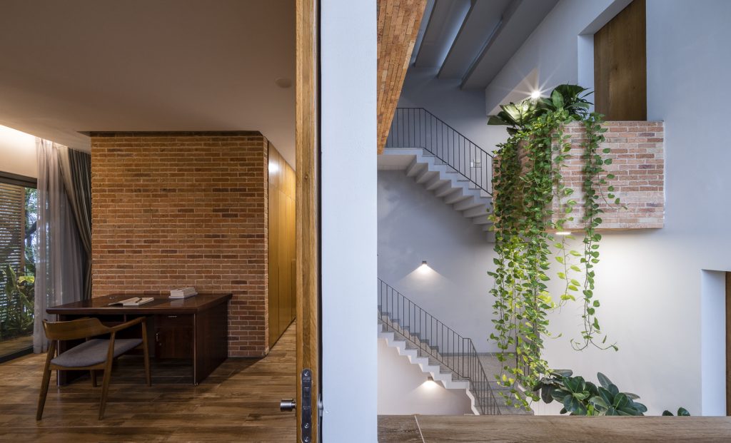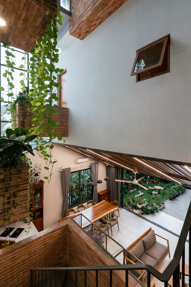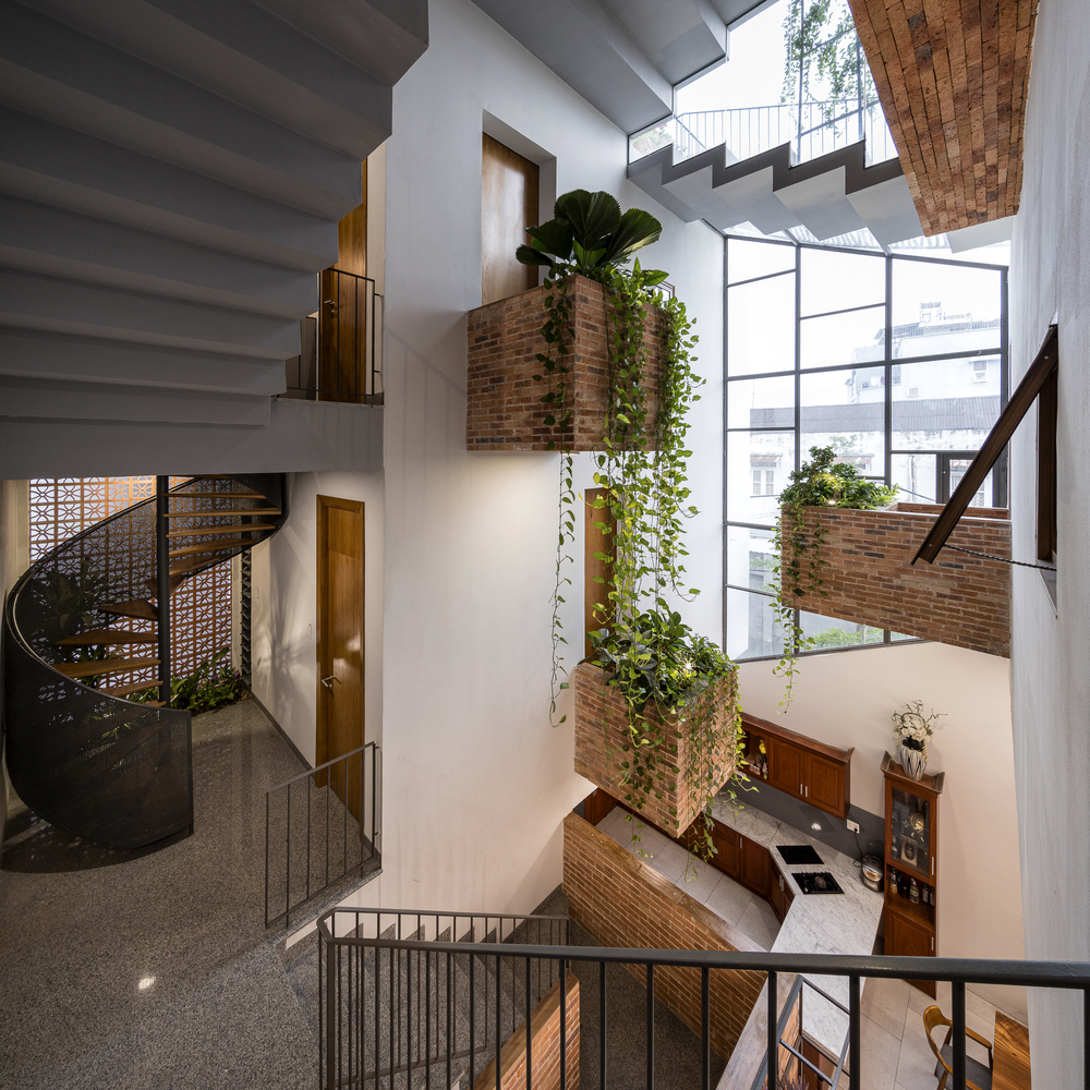 Các ngăn ban công được nhấn bằng gạch đỏ giống các thùng đựng thực vật lớn nhỏ. Chúng được sắp xếp theo một trật tự không định hướng và diễn ra ở nhiều nơi trong nhà cho các hoạt động trồng cây thiết thực. Bằng cách này, ngôi nhà luôn được bao phủ bởi màu xanh lá cây mang lại cảm giác thư thái, giảm stress cho gia đình.