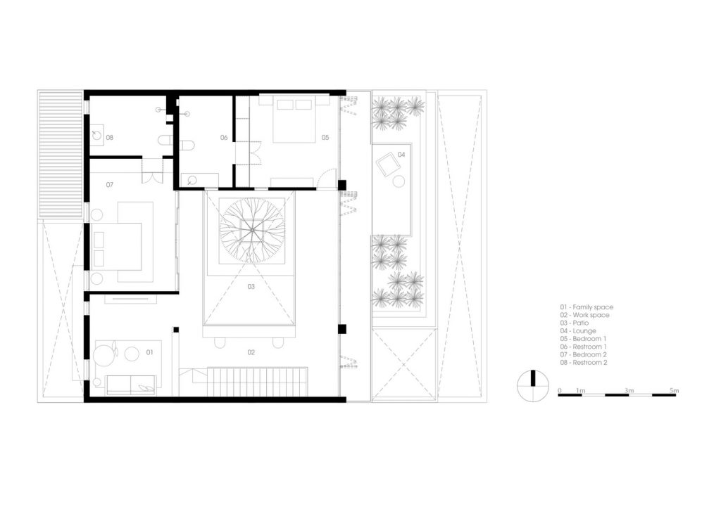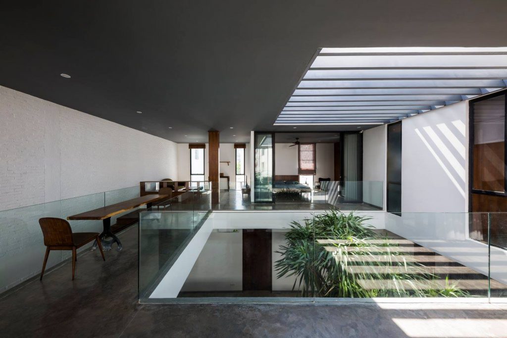 Ở tầng trệt, sân trong mang lại đủ ánh sáng cho bồn cây đầy tính nhiệt đới ở trung tâm, cũng chính là trọng tâm của không gian mở để phân chia bếp và phòng ăn với phòng khách.