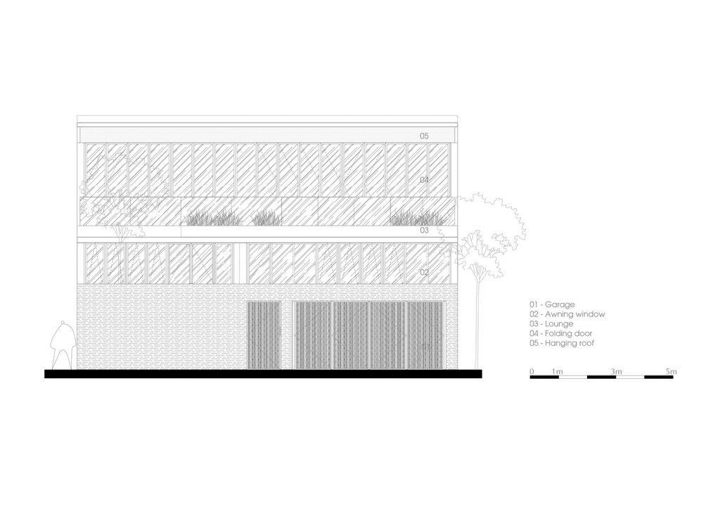 Tầng trệt được nâng cao một chút so với mặt phố để giữ cho tầm nhìn từ khu ăn uống qua sân để xe, trong khi hàng rào tường phía trước mang lại sự riêng tư hoàn toàn và tách biệt ngôi nhà với đường phố đông đúc.