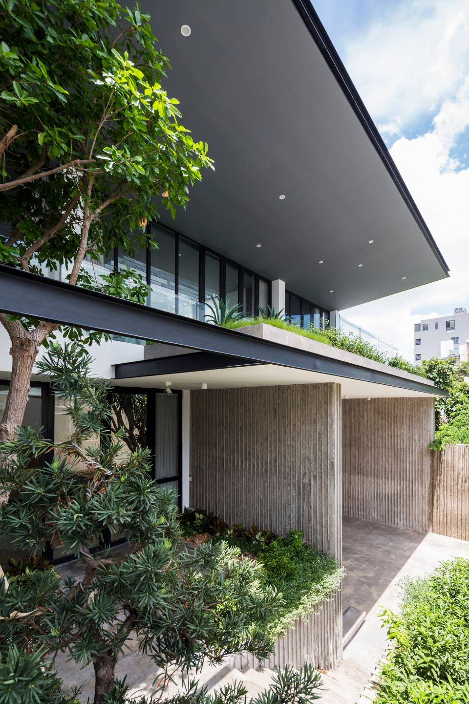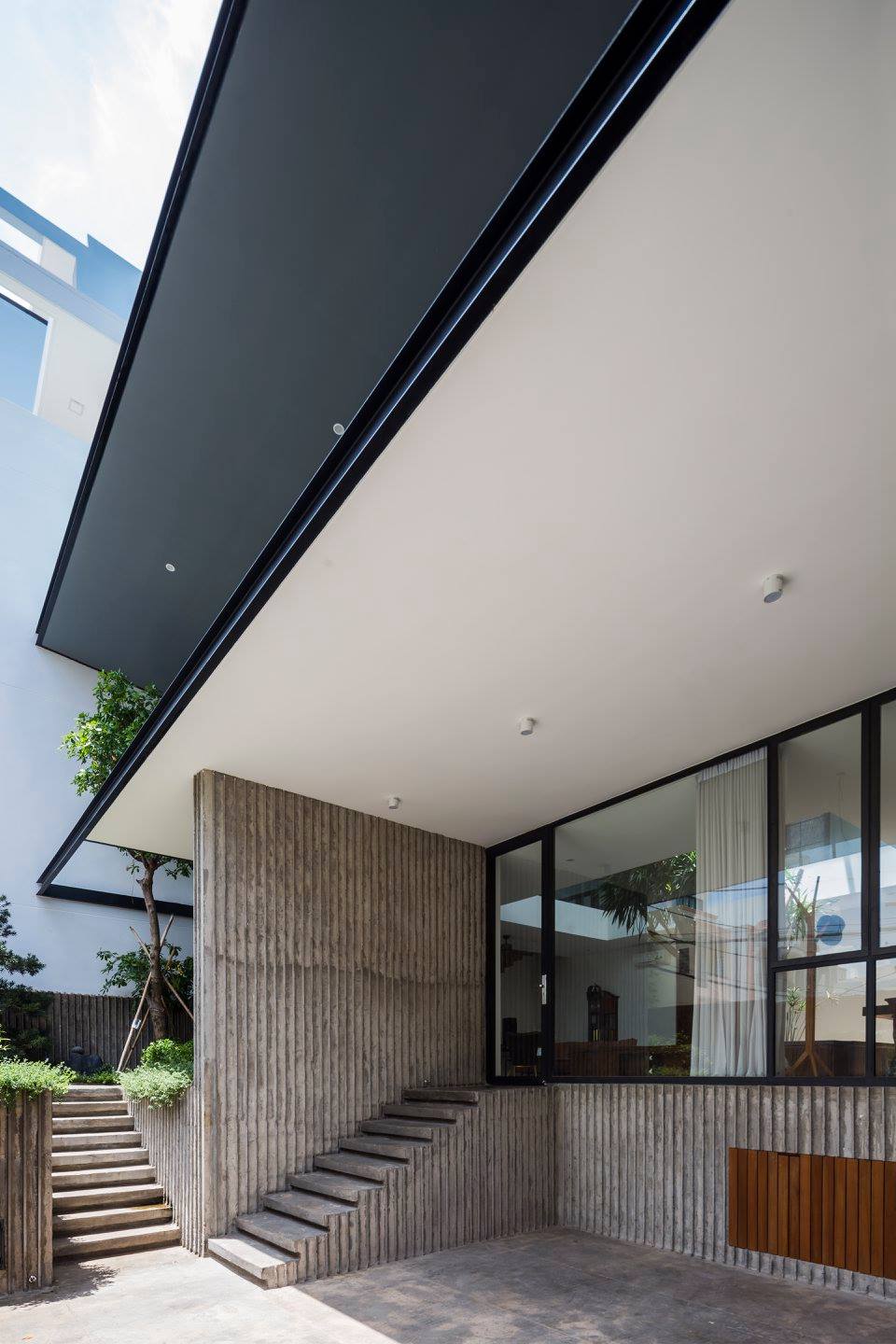 Tầng trệt được nâng cao một chút so với mặt phố để giữ cho tầm nhìn từ khu ăn uống qua sân để xe, trong khi hàng rào tường phía trước mang lại sự riêng tư hoàn toàn và tách biệt ngôi nhà với đường phố đông đúc.