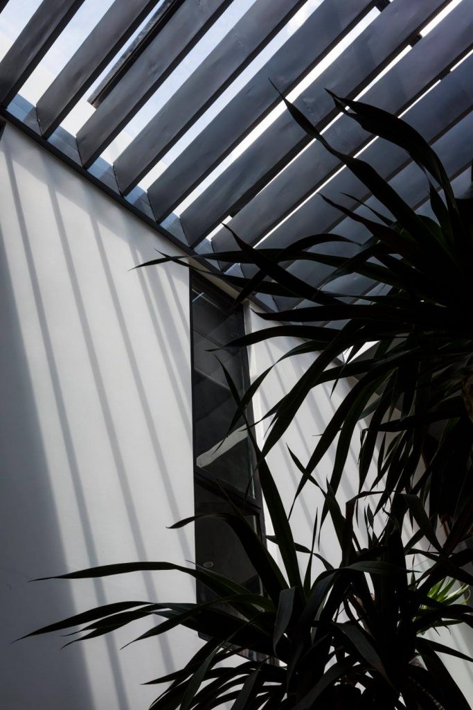 Ngôi nhà được thiết kế theo hướng Tây, một tấm chắn nắng tự động kiểm soát ánh sáng mặt trời chiếu qua cửa sổ trời lớn có thể mở ra ngoài sân để giúp ngôi nhà luôn mát mẻ và kiểm soát ánh nắng trực tiếp.