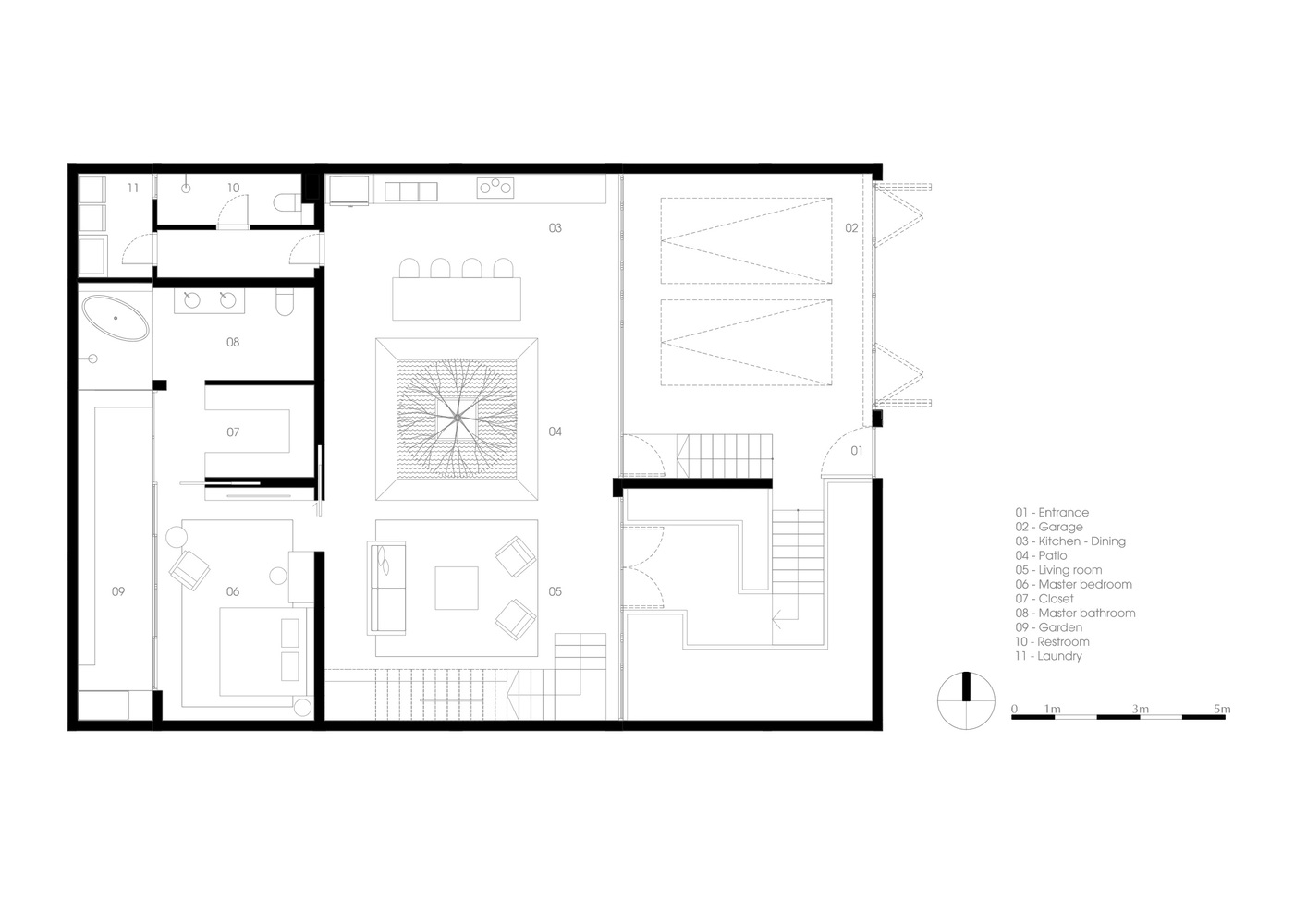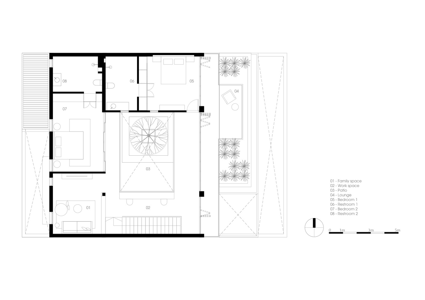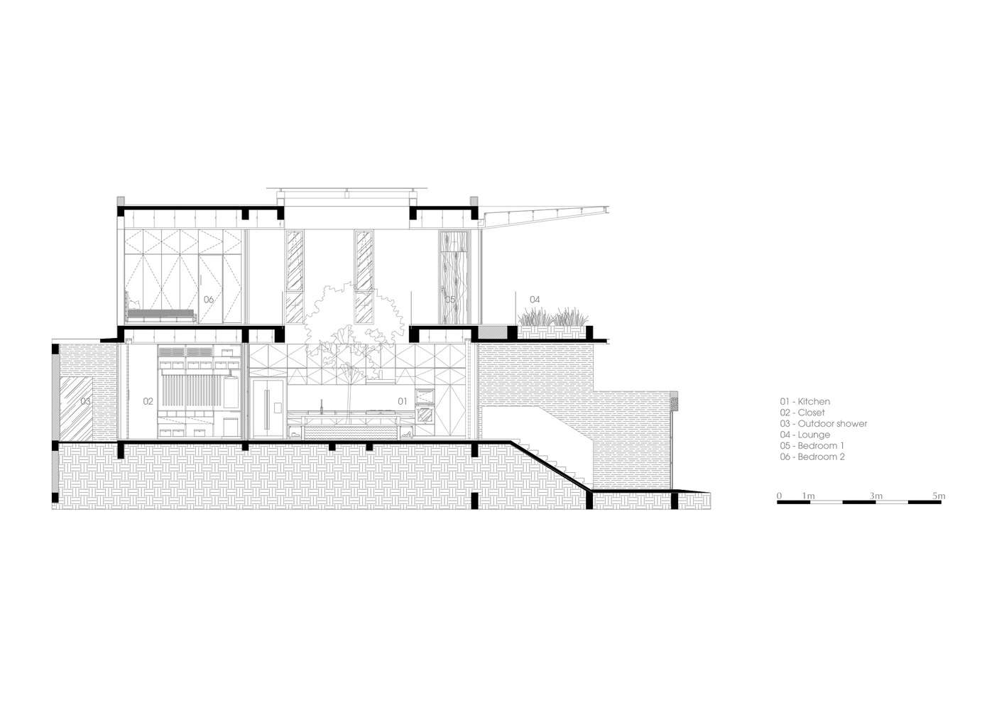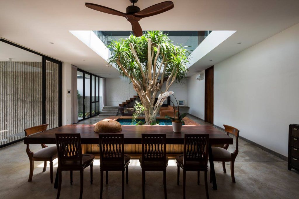 Ở tầng trệt, sân trong mang lại đủ ánh sáng cho bồn cây đầy tính nhiệt đới ở trung tâm, cũng chính là trọng tâm của không gian mở để phân chia bếp và phòng ăn với phòng khách.