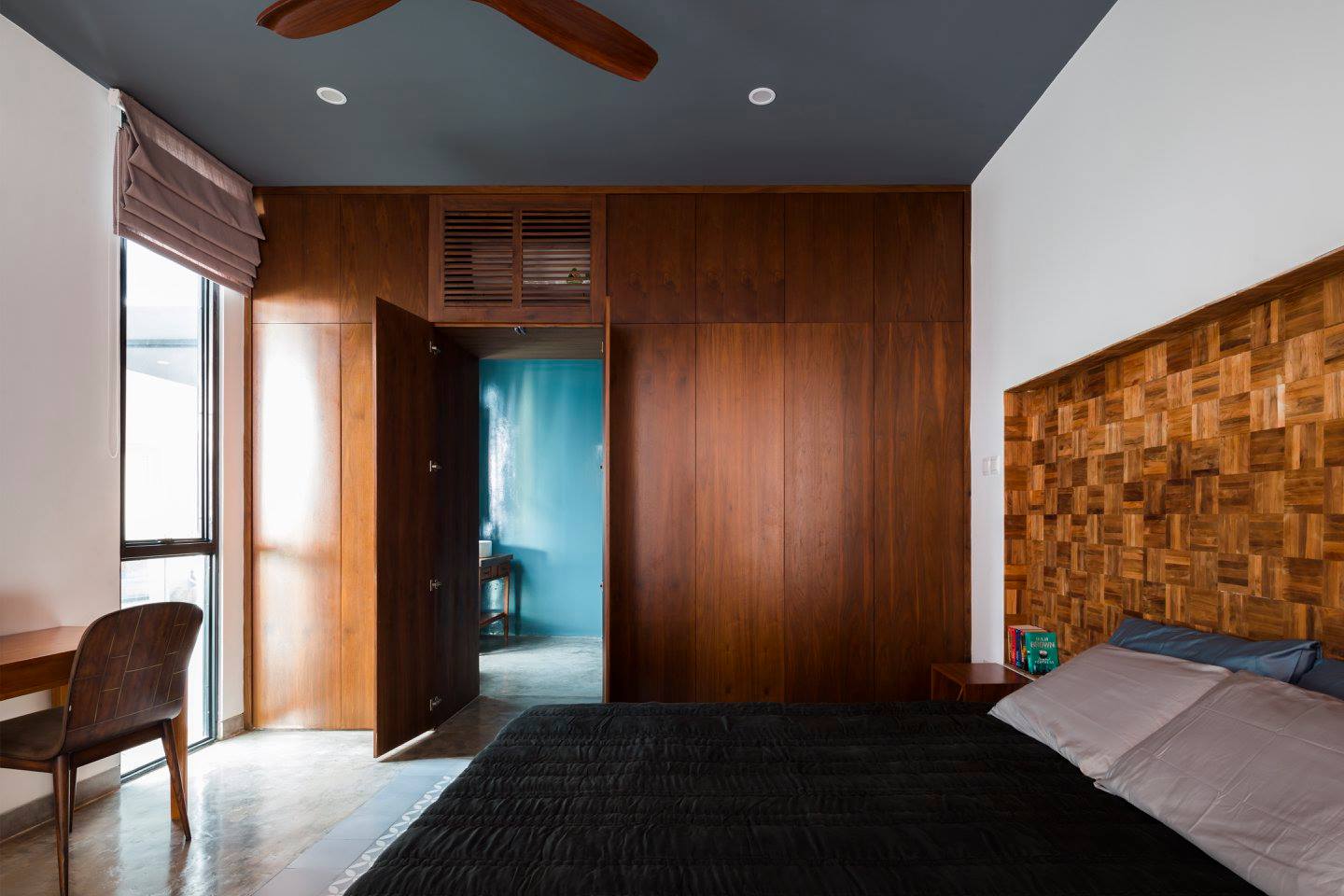 Phía sau là phòng ngủ chính, với cửa sổ trượt lớn ra sân sau vẫn mang lại cảm giác rộng mở. Phòng tắm cũng là không gian mở.