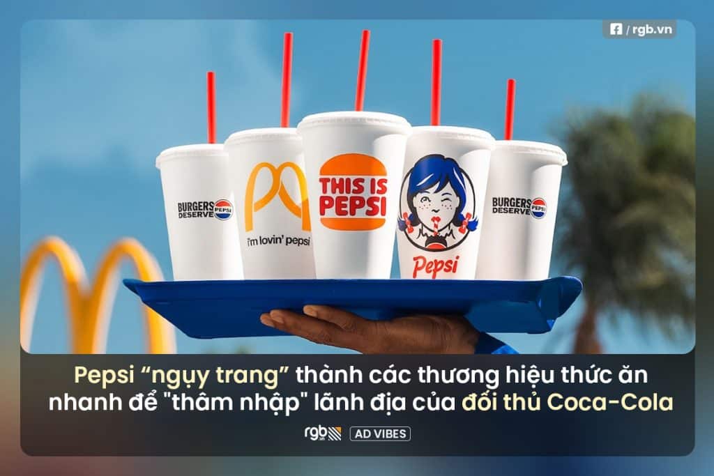 Biểu tượng kinh điển của McDonald’s được biến tấu thành hai chữ P với dòng chữ “Im Lovin’ Pepsi”, trong khi logo của Burger King tự tin khẳng định “This is Pepsi” với kiểu chữ retro. Thậm chí, mascot Wendy cũng được “làm mới” với mái tóc xanh, nháy mắt vui nhộn khi thưởng thức một ly Pepsi.