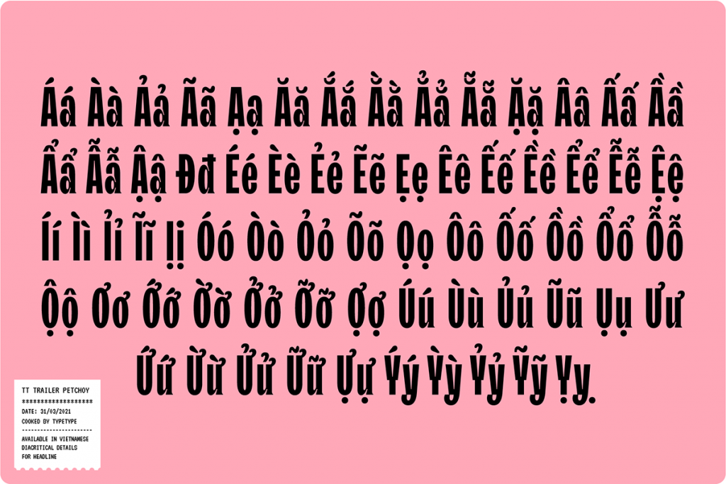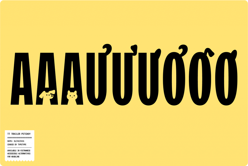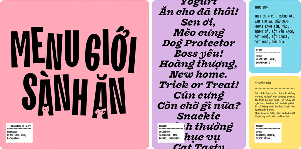 Bên cạnh đó, không chỉ dừng lại ở TT Trailers, PetChoy còn sử dụng thêm những bộ phông chữ khác để tạo nên hệ thống phông chữ hoàn chỉnh bao gồm: Fragan Italic sử dụng cho các tiêu đề phụ, VT323 cho phần mô tả menu và Nunito cho phần thân nội dung.