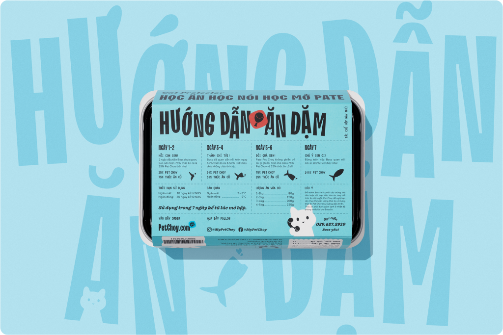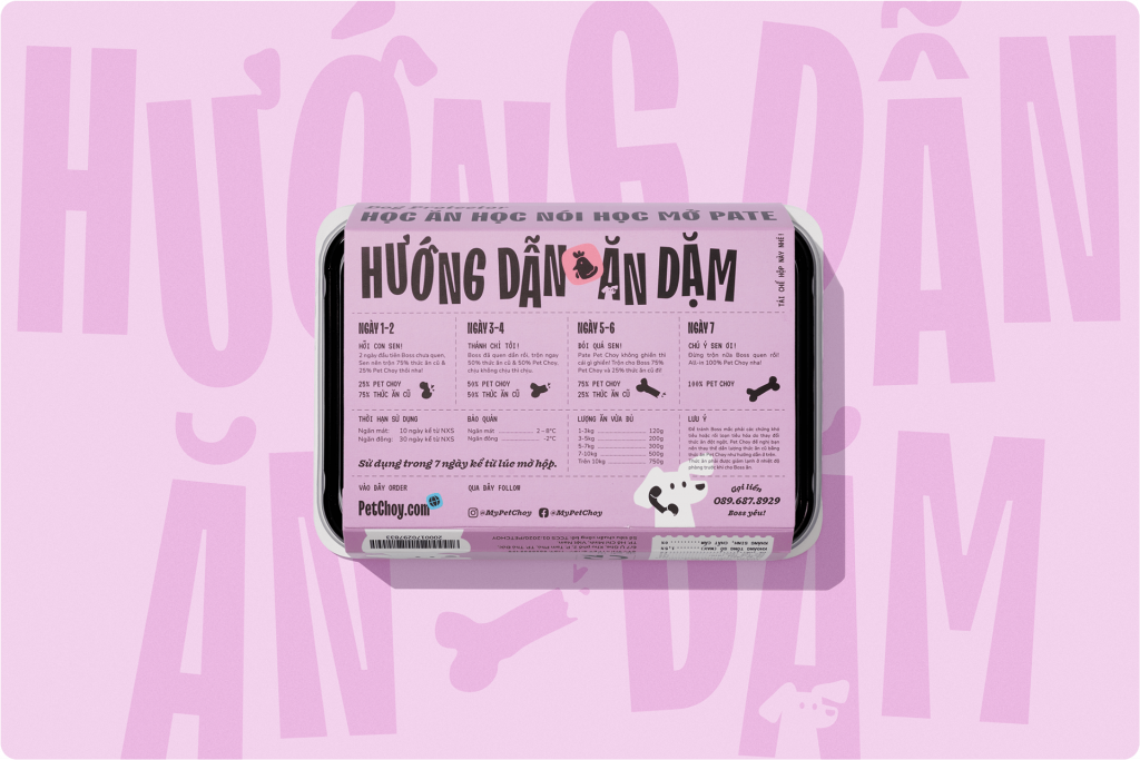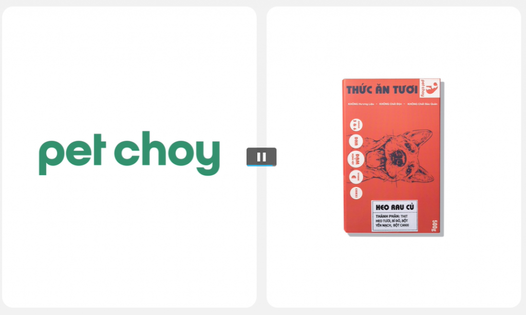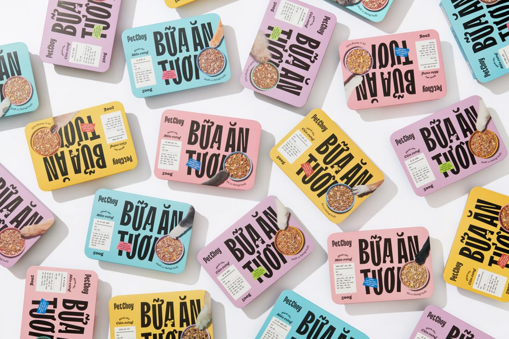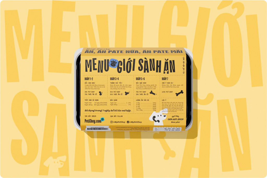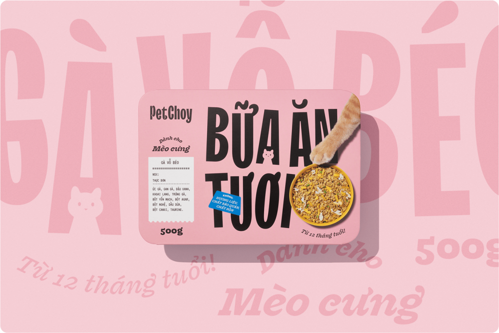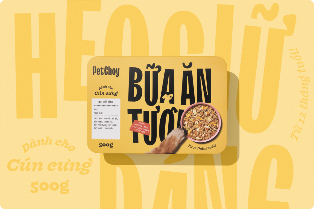 Trái ngược với tiêu chuẩn thông thường của thị trường, chúng tôi đã sử dụng bao bì theo bố cục dựa trên typographic mà “Bữa Ăn Tươi” trở thành yếu tố chính, đưa ra thông điệp mạnh mẽ để xác định sản phẩm và phân biệt PetChoy trên kệ với những thương hiệu khác sử dụng hình ảnh thú cưng. Bàn chân và biểu tượng chó / mèo sẽ mô tả sản phẩm dùng để làm gì, bổ sung với vé nhà hàng cung cấp thông tin đầy đủ về bữa ăn.