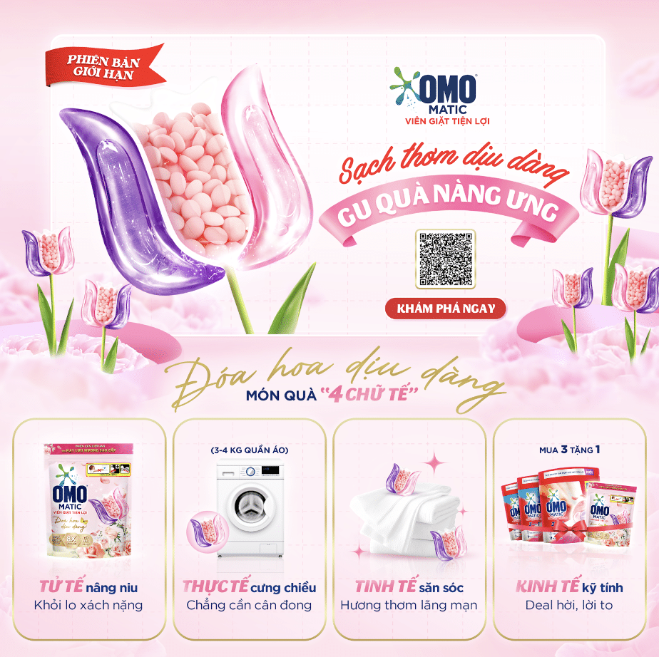 Nhân dịp ngày 20/10 – một trong những thời điểm mua sắm quan trọng trong năm, OMO mong muốn nâng tầm hình ảnh thương hiệu và tiếp tục xây dựng mối liên kết mạnh mẽ với khách hàng thông qua một món quà đặc biệt dành riêng cho phái đẹp: Viên giặt OMO Matic phiên bản giới hạn Đóa hoa dịu dàng. Đây không chỉ là sản phẩm Viên giặt thông thường, mà còn được thiết kế như một món quà độc đáo, tinh tế, đáp ứng cả về công năng lẫn giá trị thẩm mỹ.