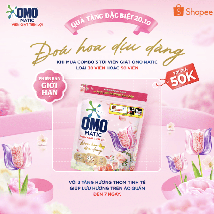Song song đó, các cụm bài PR chia sẻ mẹo chọn quà chuẩn gu của phụ nữ, tổng hợp sự kiện trong chiến dịch cũng góp phần lan tỏa thông tin, tăng độ phủ cho thông điệp và tạo ra sự nhất quán giữa các kênh truyền thông. Trên các nền tảng thương mại điện tử, OMO đã tối ưu hóa trải nghiệm mua sắm, giúp khách hàng dễ dàng sở hữu món quà độc đáo và thiết thực trong mùa lễ này thông qua các yếu tố: (1) Hình ảnh bổ trợ nhấn mạnh những yếu tố nổi trội của sản phẩm và cách sở hữu món quà độc đáo Viên giặt OMO Matic phiên bản giới hạn Đóa hoa dịu dàng trong tháng 10; (2) loạt banner, các ấn phẩm truyền thông về sản phẩm Viên giặt tiện lợi OMO Matic trên trang Shopee Mall của Unilever về chăm sóc gia đình.
