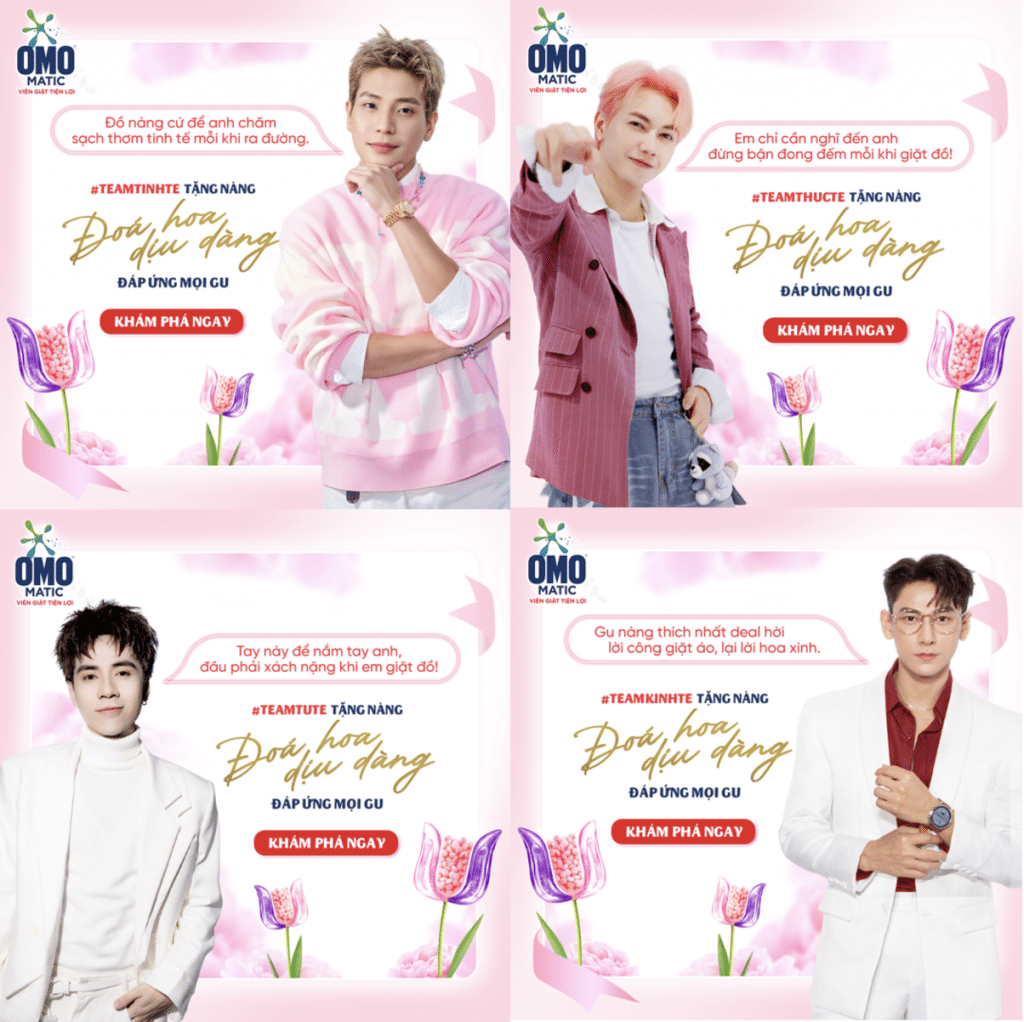 Đầu tiên, để tăng cường độ phủ sóng và nhận diện sản phẩm trên mọi phương tiện truyền thông, OMO đã gắn kết hình ảnh sản phẩm Viên giặt tiện lợi OMO Matic với 4 KOLs nổi bật từ chương trình Anh Trai Say Hi là Isaac, Quân A.P, Quang Hùng MasterD và JSOL. Họ đại diện cho từng #TeamTinhTe, #TeamThucTe, #TeamTuTe và #TeamKinhTe – 4 chữ TẾ đặc trưng của gu quà nàng ưng. Sau khi đăng tải hình ảnh của từng “anh trai” với gu quà mà họ đại diện, chiến dịch kích thích tương tác với cộng đồng thông qua bình chọn công khai (public voting) để người tiêu dùng bình chọn món quà lý tưởng cho ngày 20/10. Từ đó, OMO dẫn dắt họ đến với microsite để tìm hiểu thêm về sản phẩm Viên giặt OMO Matic phiên bản giới hạn Đóa hoa dịu dàng.