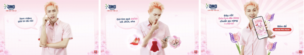Để tiếp cận đa kênh và đảm bảo độ phủ sóng cao, OMO đã triển khai các video quảng cáo ngắn với thời lượng 6 giây và 15 giây cùng sự tham gia của 4 “anh trai” – Isaac, Quân AP, Quang Hùng MasterD và JSOL. Những video này được phát trên YouTube Ads, TikTok Ads và Meta, giúp lan tỏa thông điệp “quà tặng 20/10” một cách sinh động, gần gũi và dễ tiếp cận. Hình thức nội dung ngắn gọn nhưng ấn tượng này không chỉ giúp tăng độ nhận diện thương hiệu mà còn dẫn dắt người dùng đến microsite để khám phá thêm về sản phẩm Viên giặt OMO Matic phiên bản giới hạn Đóa hoa dịu dàng.