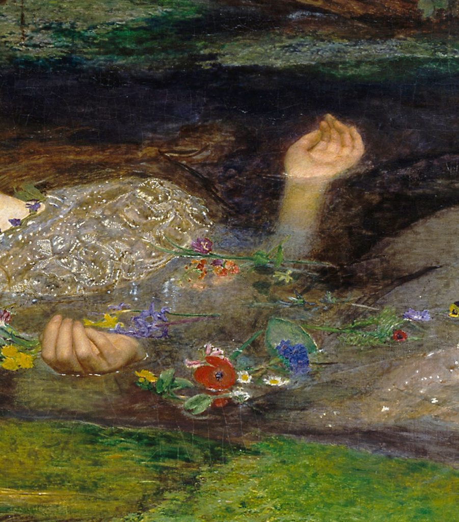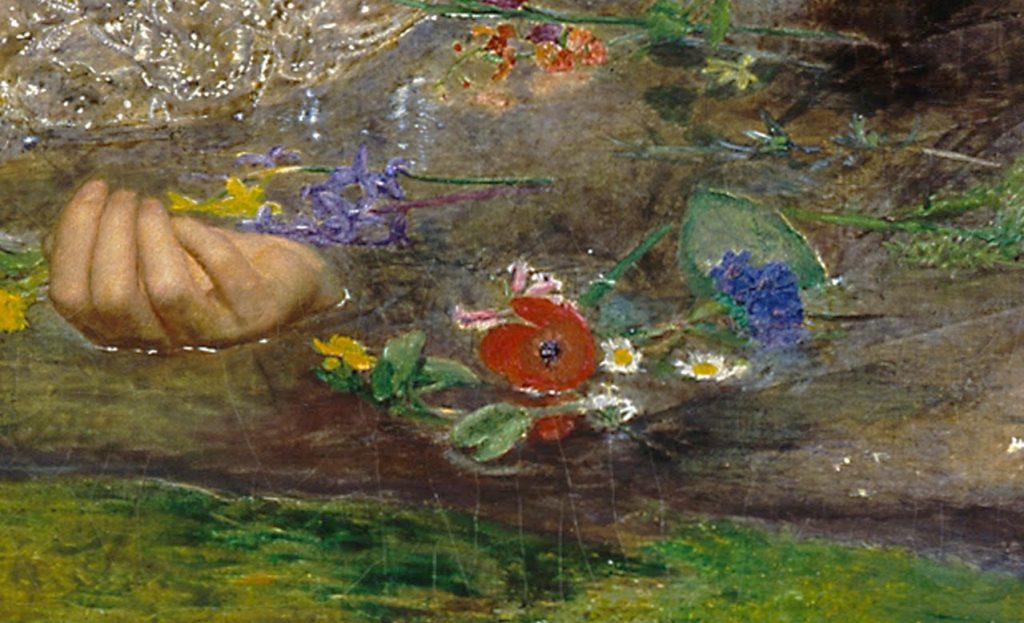 Khi nhìn bức tranh ở tầm rộng hơn, chúng ta sẽ nhận thấy bàn tay lơ lửng và vô lực của Ophelia nằm gần như chính giữa bức tranh. Đôi bàn tay mềm mại và bóng loáng chính là minh chứng của tuổi trẻ và xác nhận danh tính quý tộc hoàng gia Đan Mạch của nàng, theo mô tả trong Hamlet. Dòng nước yên bình quanh cổ tay đã khắc họa tâm tư chấp nhận cái chết một cách bình thản của Ophelia. Với hai lòng bàn tay dang rộng hướng lên trên, nàng giống như đang đầu hàng trước số phận bi thảm và chờ đợi thần chết đến.