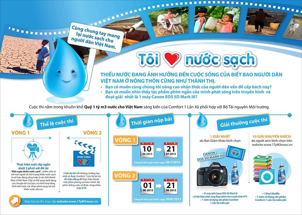 Cuộc thi làm phim ngắn “Tôi yêu nước sạch” được tạo ra để nâng cao nhận thức của người dân về tình hình thiếu nước sạch ở Việt Nam. Cuộc thi nằm trong khuôn khổ quỹ “1 tỷ m3 nước sạch cho Việt Nam”– sáng kiến của Comfort Một Lần Xả phối hợp với Bộ Tài nguyên Môi trường.