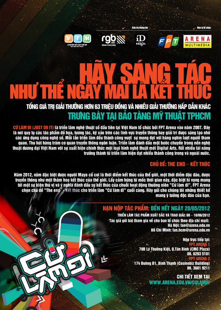 - Các tác phẩm Cứ Làm Đi sẽ được đăng tải trên facebook của FPT Arena. Căn cứ vào số lượng Like (tính đến hết ngày 31/5/2012) sẽ chọn ra 01 tác phẩm được yêu thích nhất.