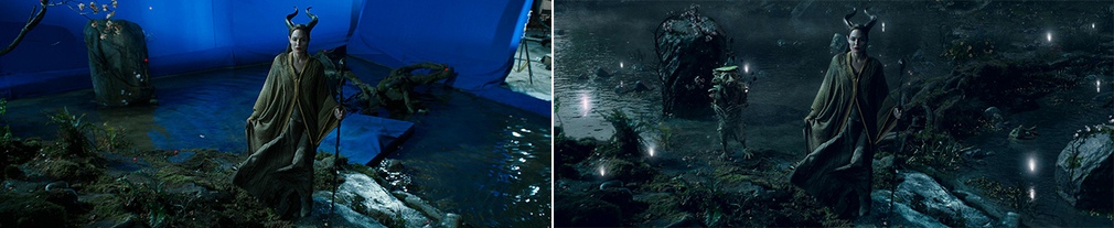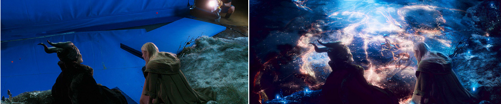 Nhóm VFX đã trao cho Maleficent phép thuật huyền bí. Valdez ghi chú về cảnh lễ rửa tội, khi mà Maleficent ám một lời nguyền vào Aurora, “chúng tôi muốn bày tỏ lòng tôn kính đối với tác phẩm Công Chúa Ngủ Trong Rừng vì những hiệu ứng đẹp tuyệt vời.” MPC dùng màu xanh là cây cho phép thuật “để tạo cảm giác nó có một dụng ý xấu xa — một màu xanh đầy thù hận”.