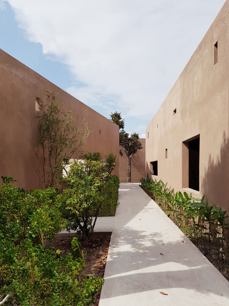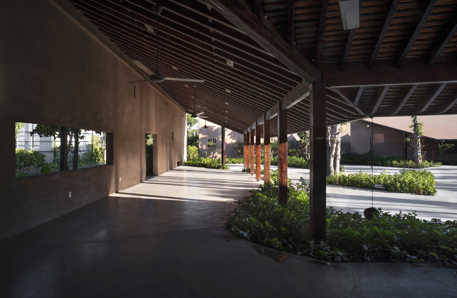 Các bức tường xuyên suốt công trình tạo sự ngăn cách giữa không gian chính và khu vực hành lang. Ngoài việc đóng mở, các khoảng trống trên tường còn có chức năng thông gió và lấy sáng tự nhiên.